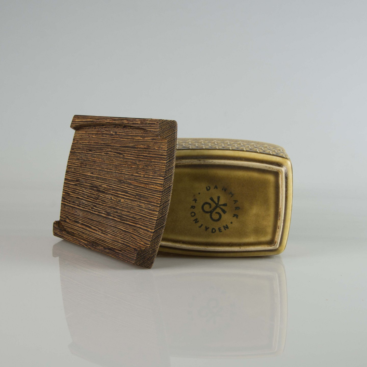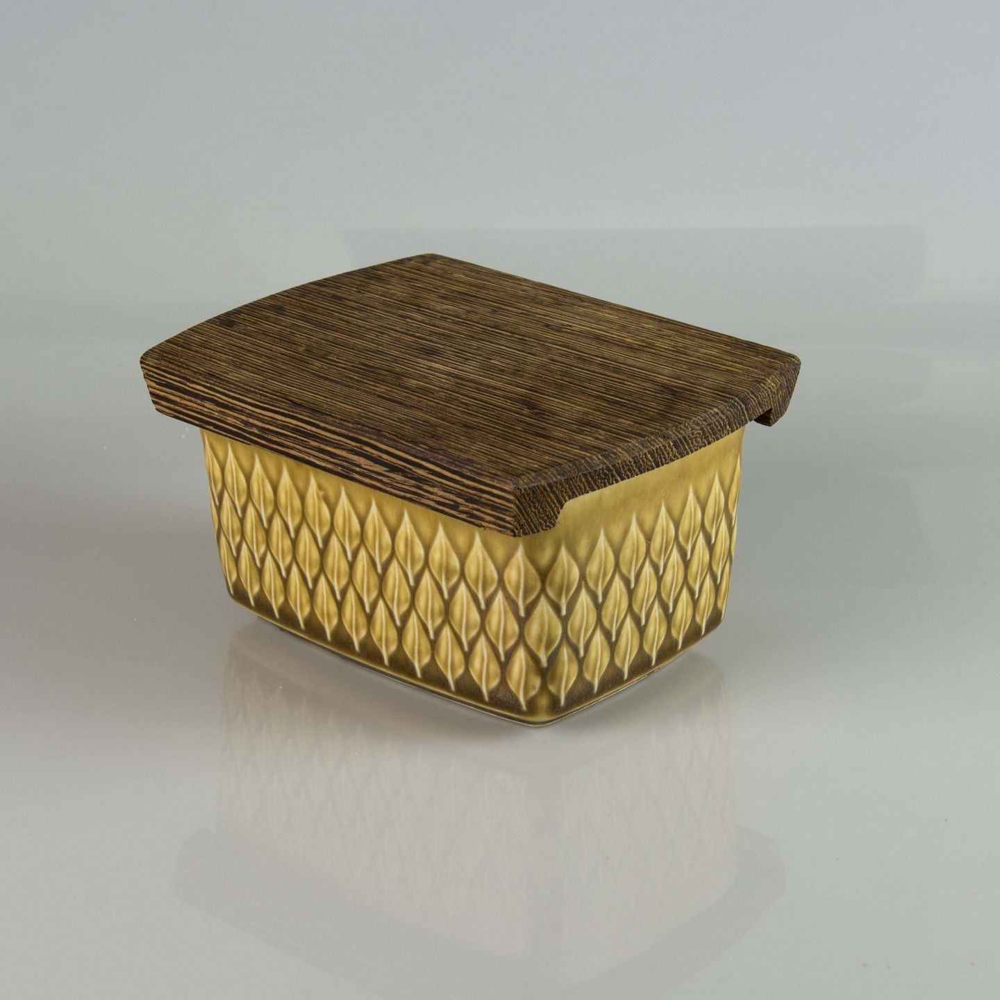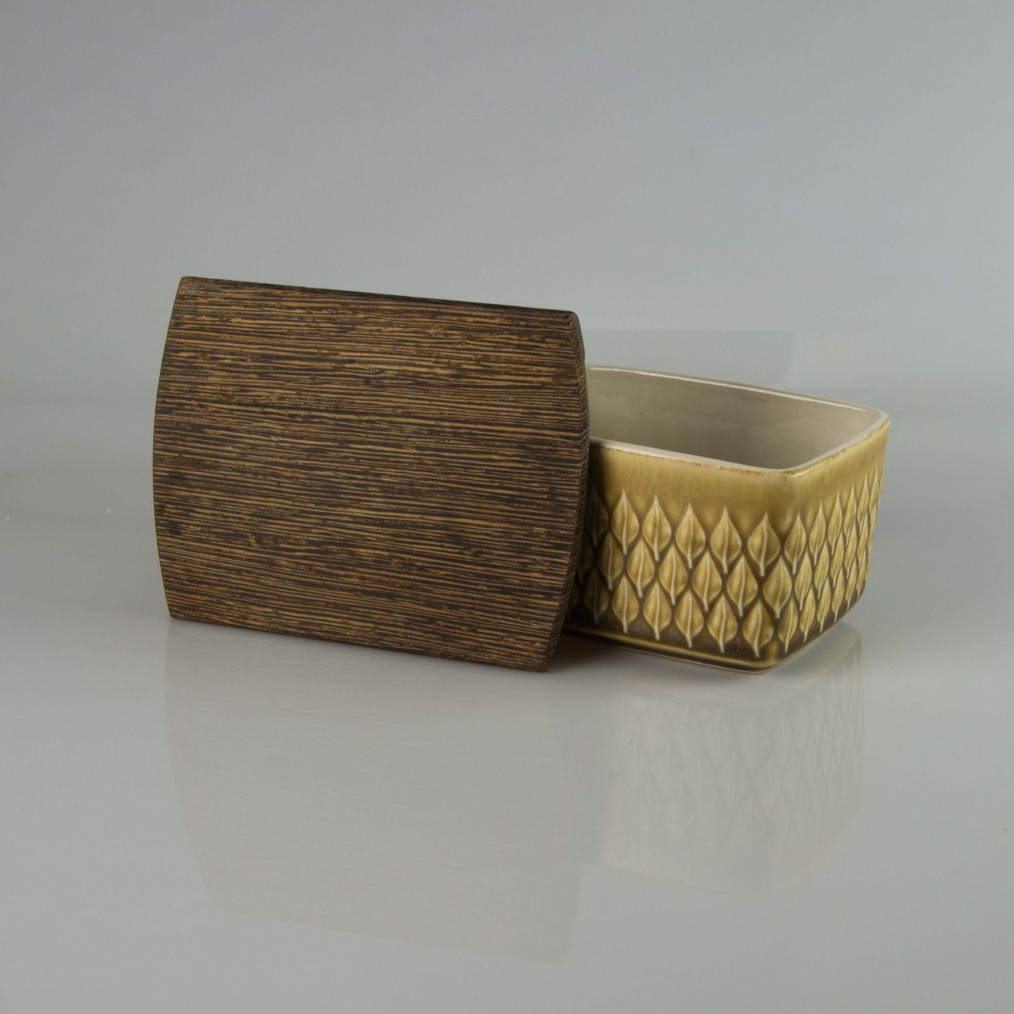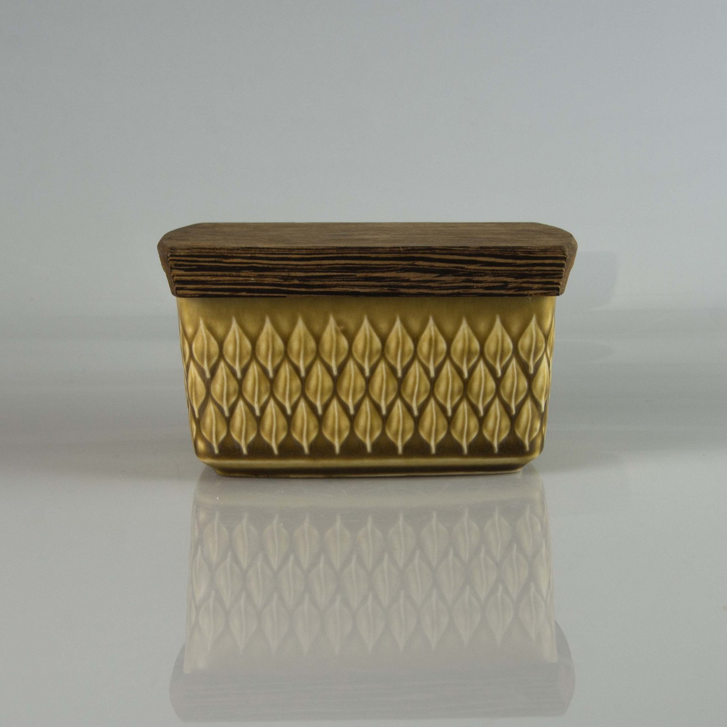 Stel i gulligt stentøj med motiv af blade og låg i træ.