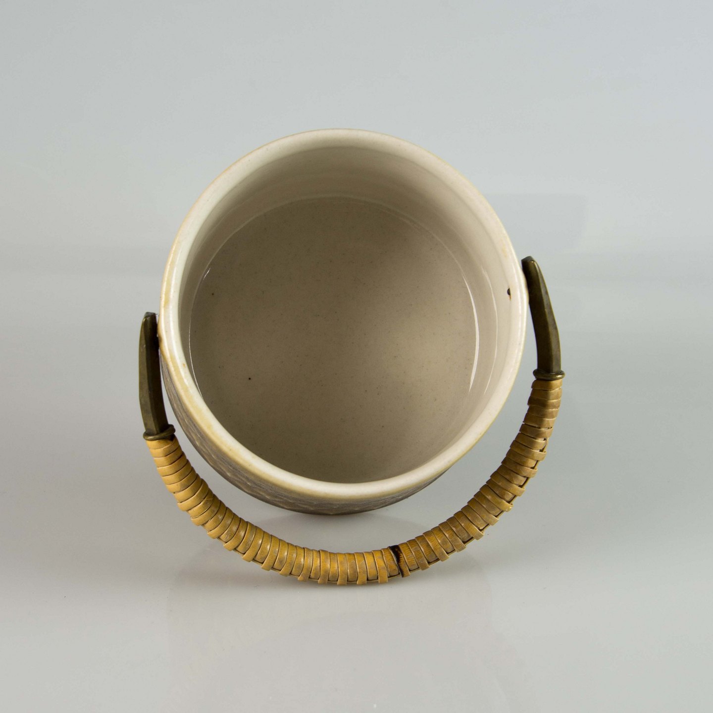 Stel i gulligt stentøj med motiv af blade og håndtag i messing beklædt med bambusflet.