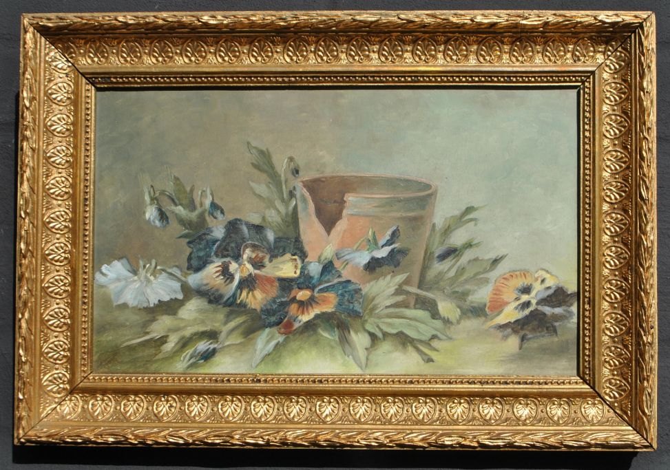 Nielsen, R. Hjortø (20. årh.) Danmark: Opstilling med stedmoder blomster. Olie på pap. Verso signeret: R Hjortø Nielsen 1910. 19,5 x 32 cm.