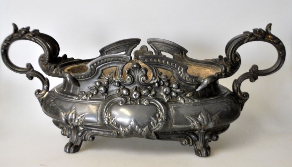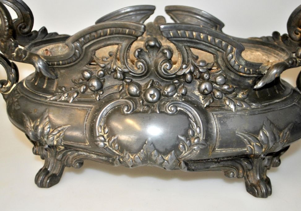 Fransk blomster centerpiece i tin, 19. årh. Rococo stil. Med fire ben og to hanke. Dekorationer i form af blomster og bladværk.Stemplet.: Depose 903. Indsats til blomster af zink. L.: 38 cm. H.: 18 cm.