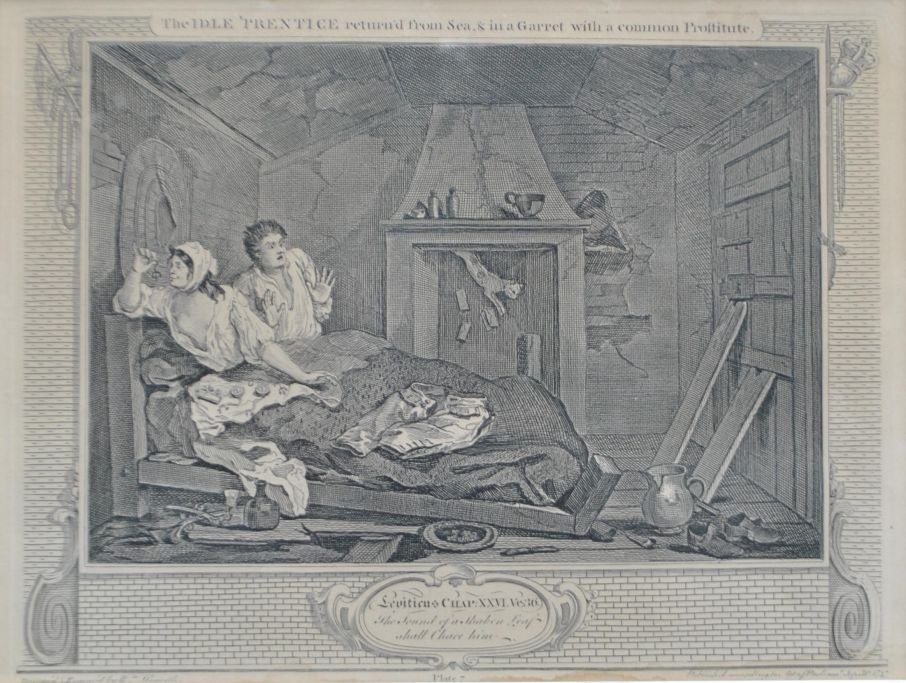 Hogart, William (1697 - 1764) England: The idle prentice returned from sea & in a Garret with a common Prostitute. Signed. 28 x 36.5 cm. Printed in 1747.