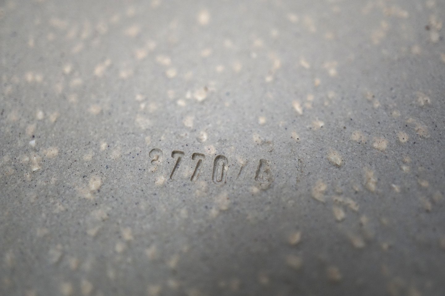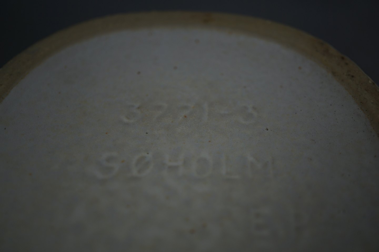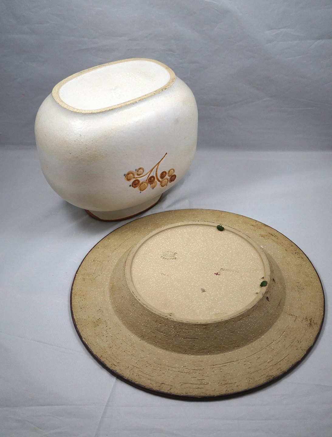Text available in Danish: Søholm Keramik. Vase nr. 3771, fad nr. 3770. Vasen er oval, begge dele er cremefarvet og dekoreret med lysebrune blomster. Delene er signeret E.P.