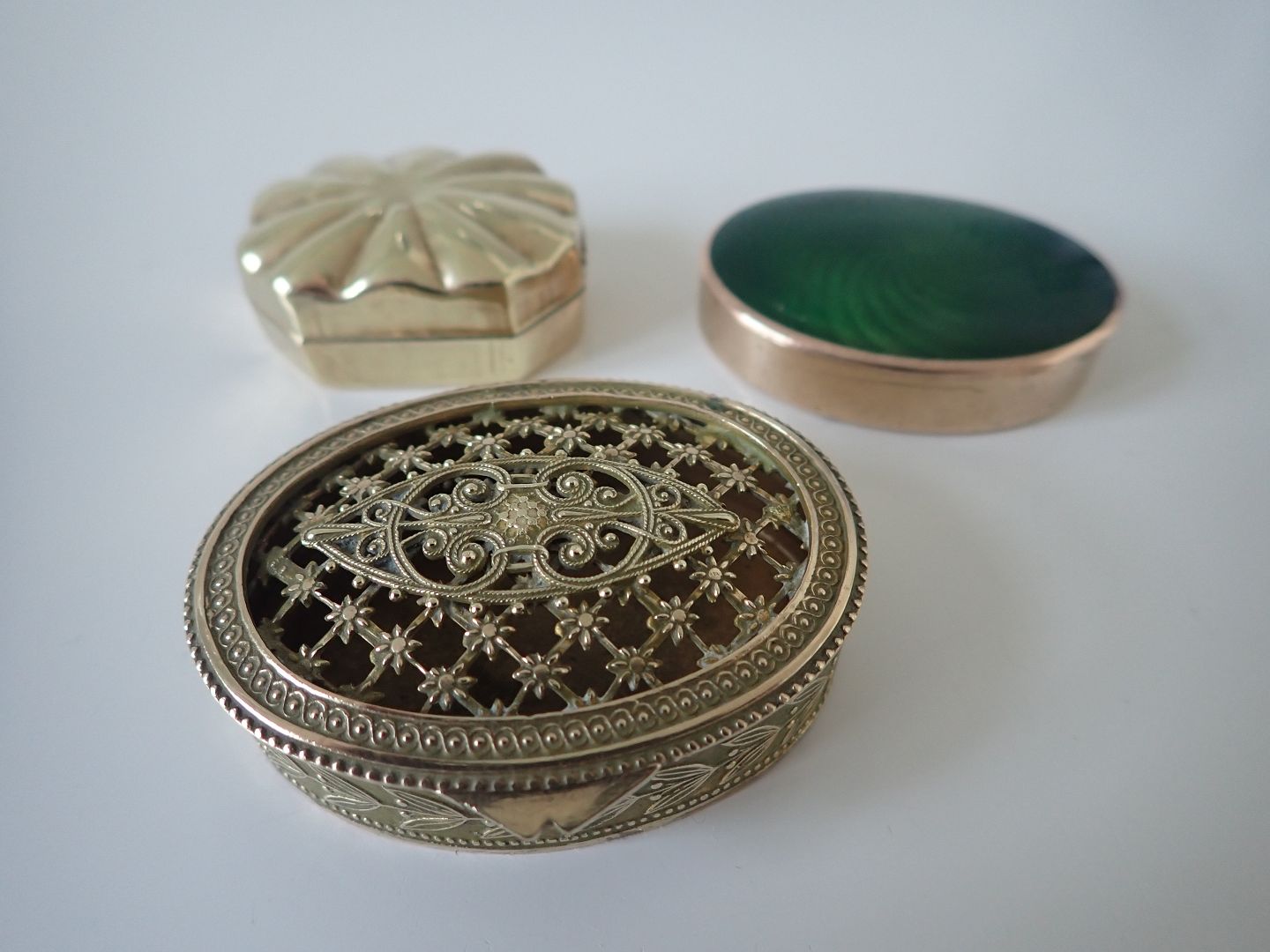Til højre: Oval pilleæske i guilliocheret messing med grøn emalje. Formentlig England ca. 1940. Længde: 5,4 cm. Bredde: 4 cm. Højde: 1,3 cm. Let slid på emaljen; men ingen afslag. Solgt.