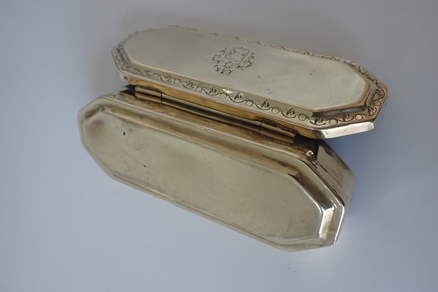 2 tobaksdåser i messing. Den ovale dåse i forgrunden er solgt.