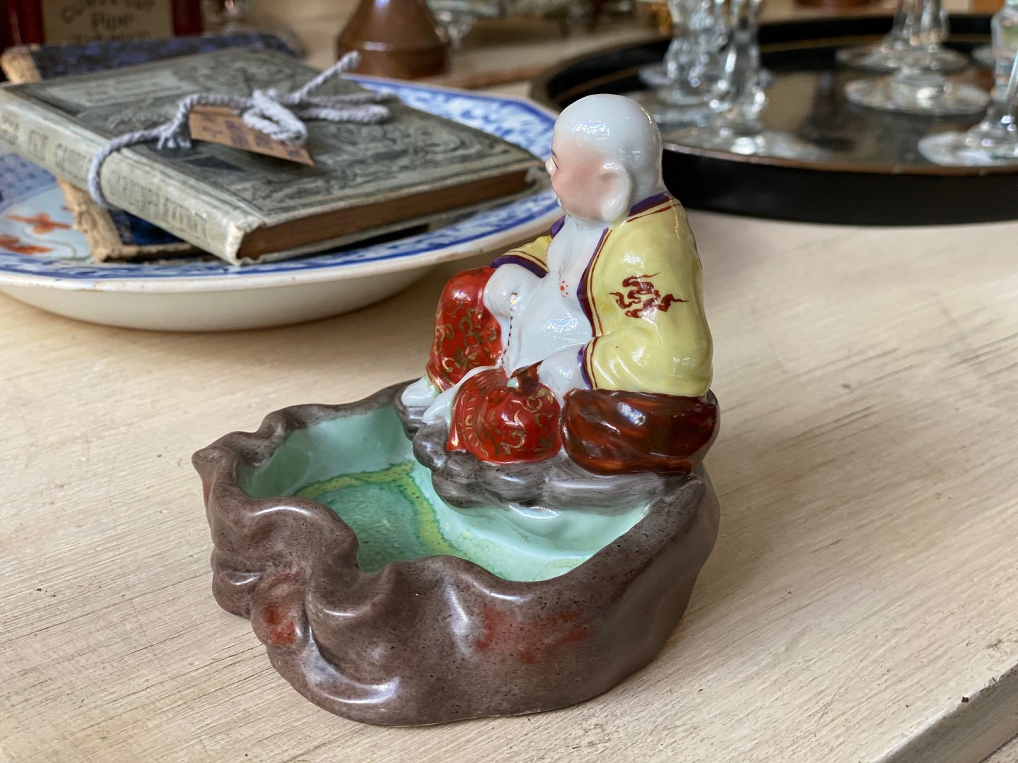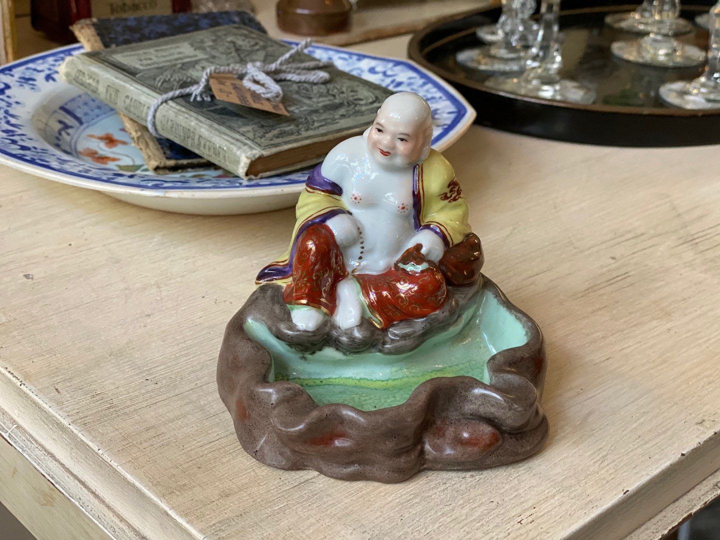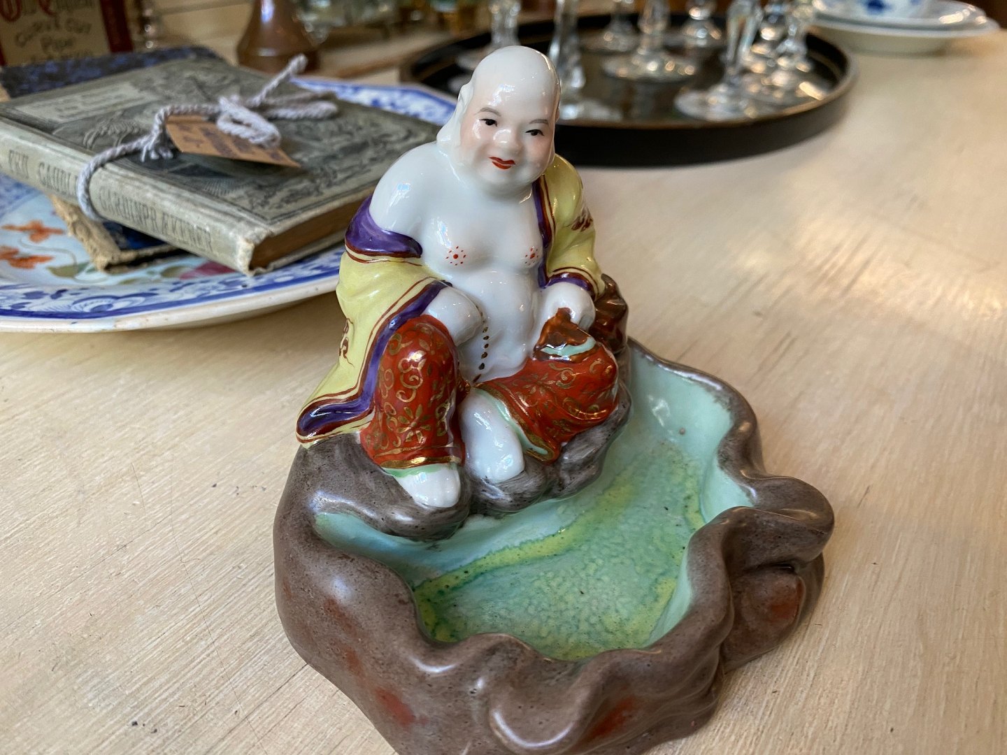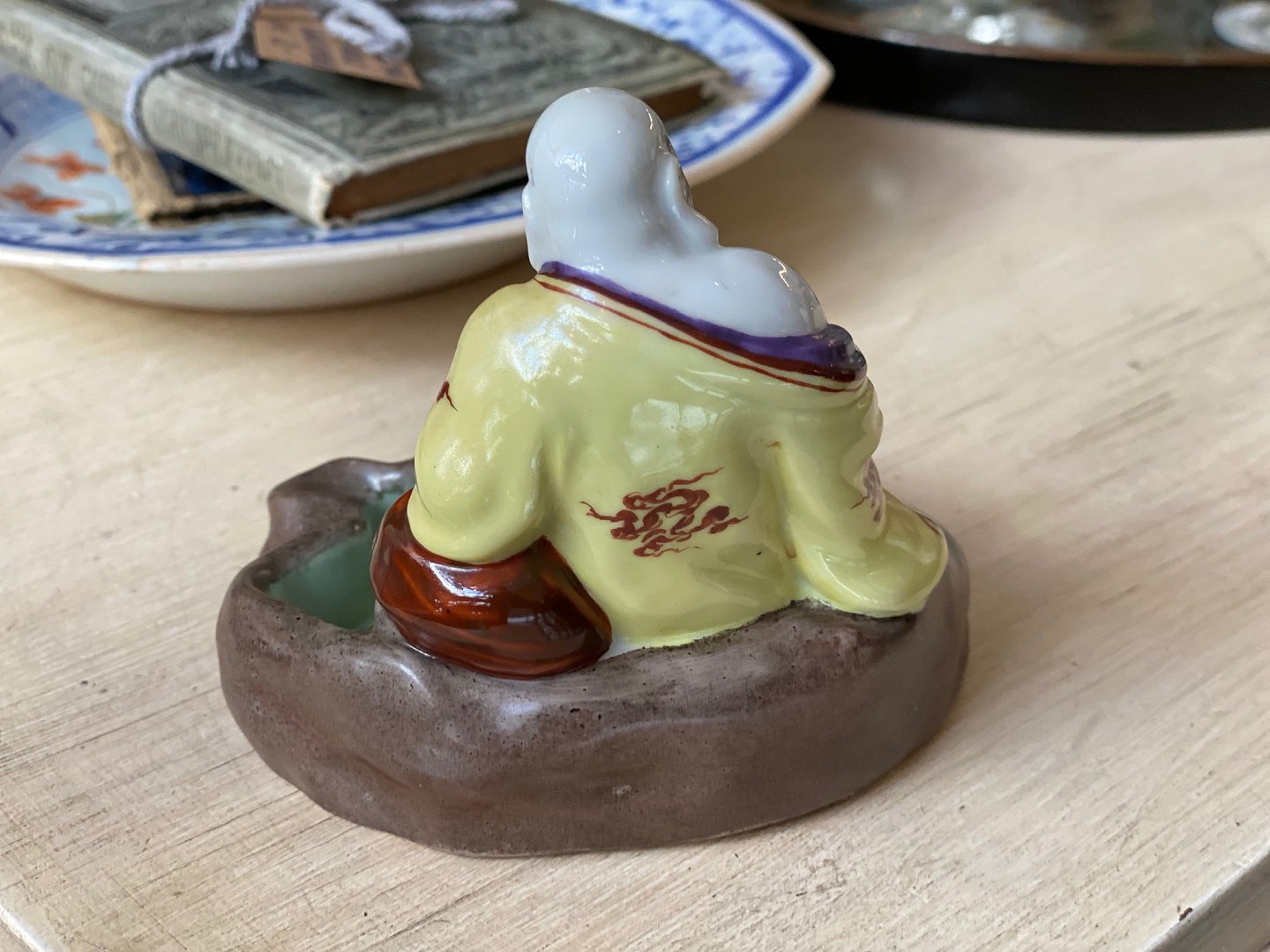 | Small hand painted Chinese smiling Buddha / Budai porcelain figurine on bowl. Height approx. 9.50 centimeters, width approx. 9.80 centimeters. Very nice condition. SKU 1469