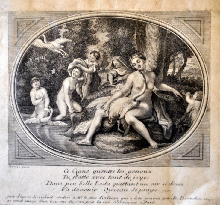 Fransk kunstner (18. årh.) Leda med svanen. Kobberstik. 9 x 11,5 cm.