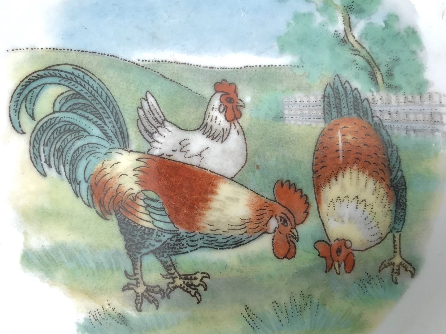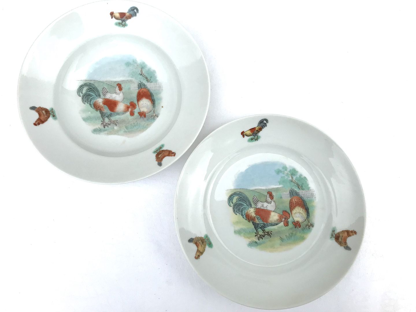 Børne tallerkner, Dyb & flad tallerken, 19,5cm i diameter, Motiv af høns på landet *Pæn brugt stand*