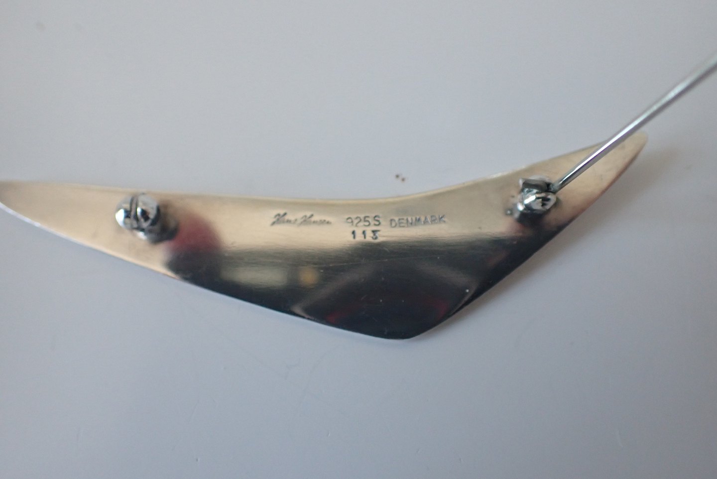 Hans Hansen (1884 - 1982) "Peak" broche i sterling sølv designet af Bent Gabrielsen (1928 2014) - dessin: 113. Længde: 7,5 cm. Bredde: 1.1 cm. Vægt: 12,3 gram. Tidligt Hans Hansen stempel: HiH.Ca. 1930. Pris: 1100 kr.