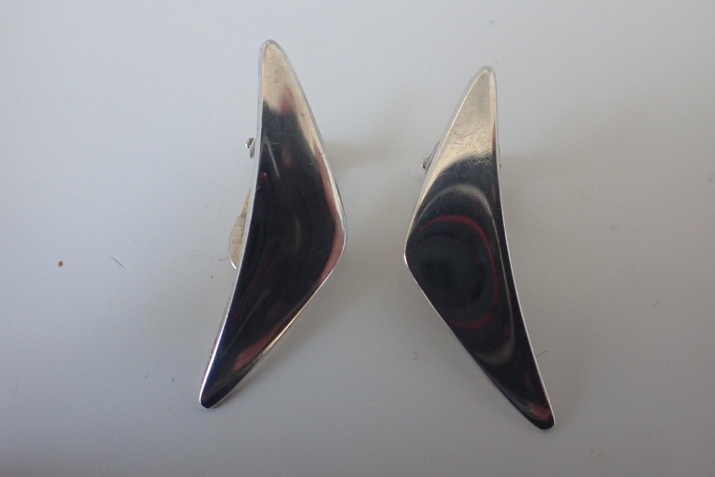 "Peak" øreclips i sterling sølv, designet før 1969 af Bent Gabrielsen (1928 - 2014) - dessin. 432 for Hans Hansen(1884 - 1982) udført i 1970-erne. Længde: 2,5 cm. Bredde: 1 cm. Vægt: 6,7 gram. I fin stand med let brugsslid. Solgt.