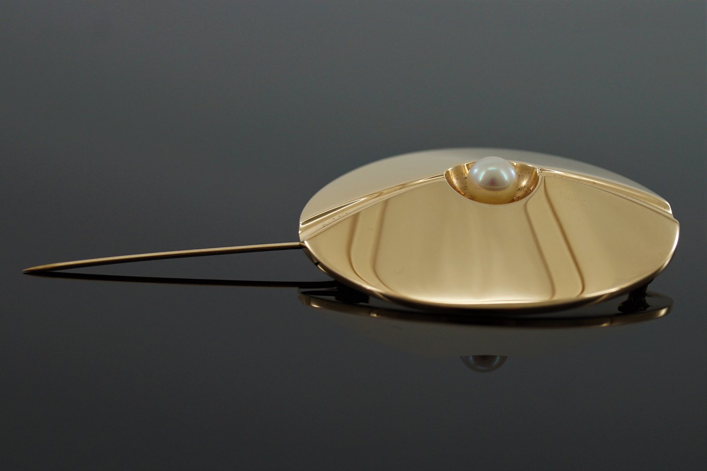 Hans Hansen; Oval broche af 14 kt. guld med perle #107