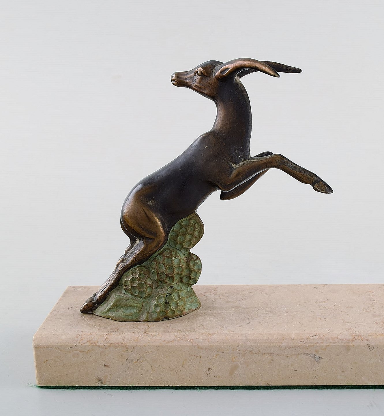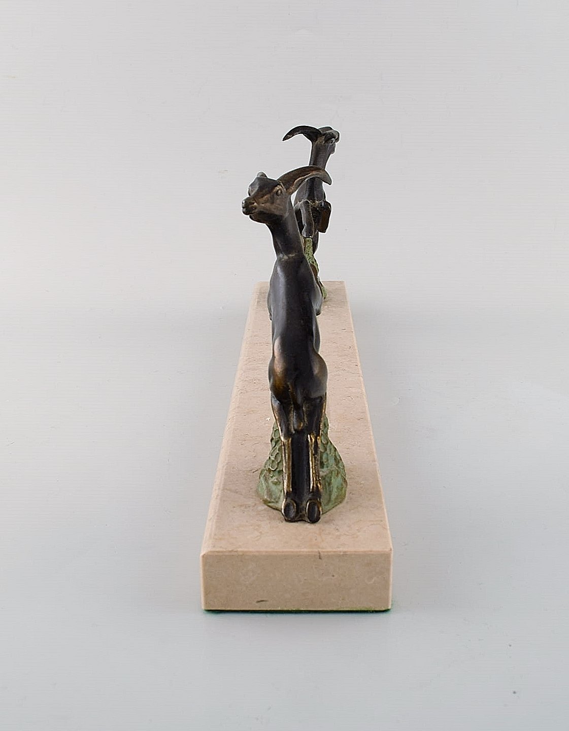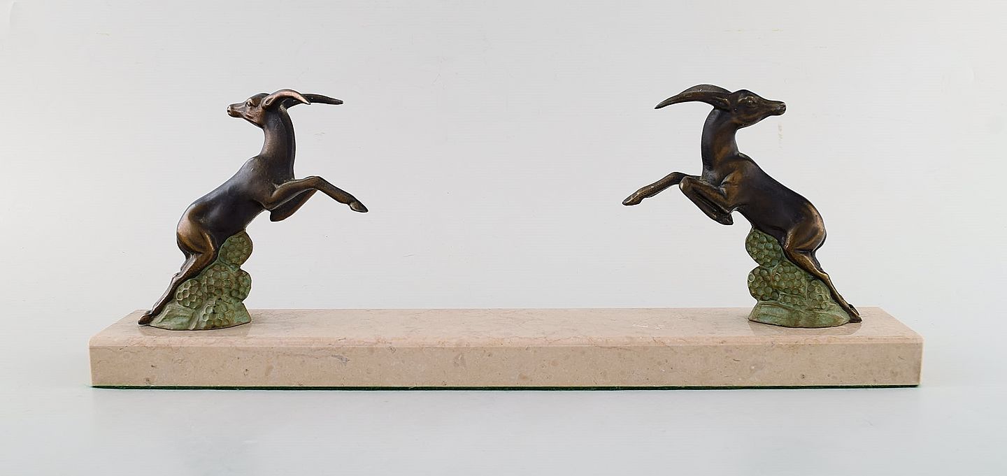 Art deco skulptur i form af springende bukke i patineret metal på marmorbase. 1930'erne.