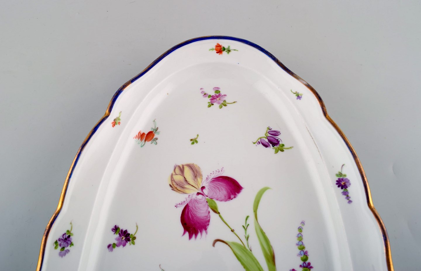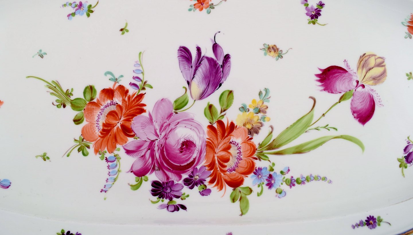 Stort antikt Meissen serveringsfad i håndmalet porcelæn, med blomstermotiver. Sent 1800-tallet.