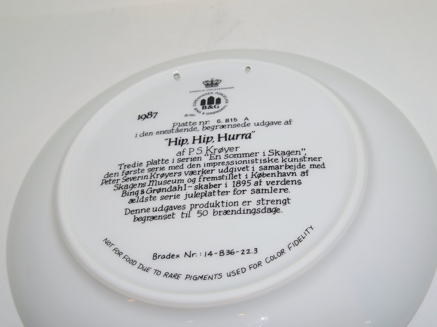 Bing & Grøndahl platte fra 1987 med Skagensbilleder, Hip Hip Hurra af P.S. Krøyer.