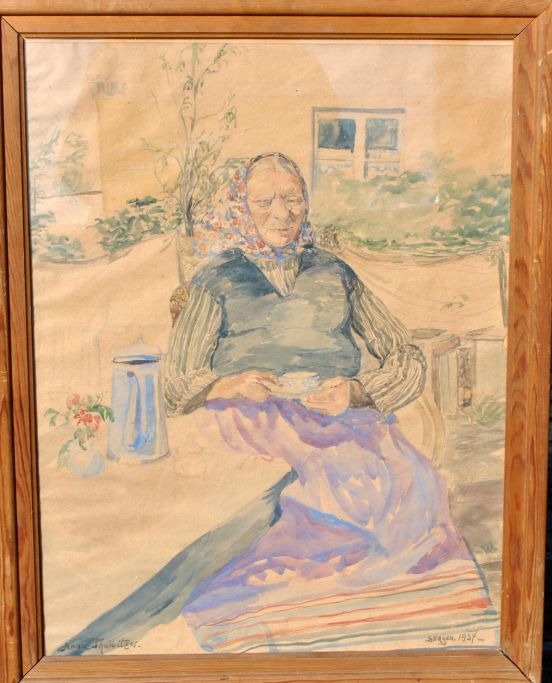 Thalbitzer, Ellen Anna Elisabeth Sophie (1884 - 1970) Danmark: Portræt af en kaffe drikkende kvinde, Skagen. Signeret 1934. 55 x 41 cm.