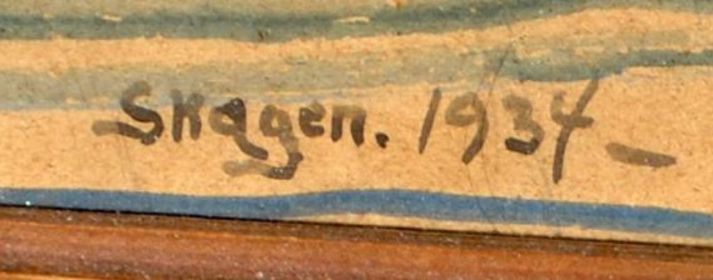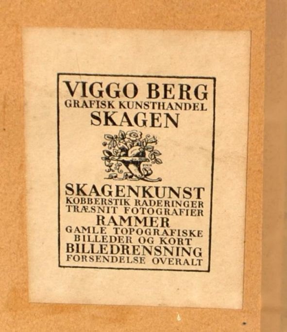 Verso etiket fra Viggo Berg, Grafisk Kunsthandel, Skagen.