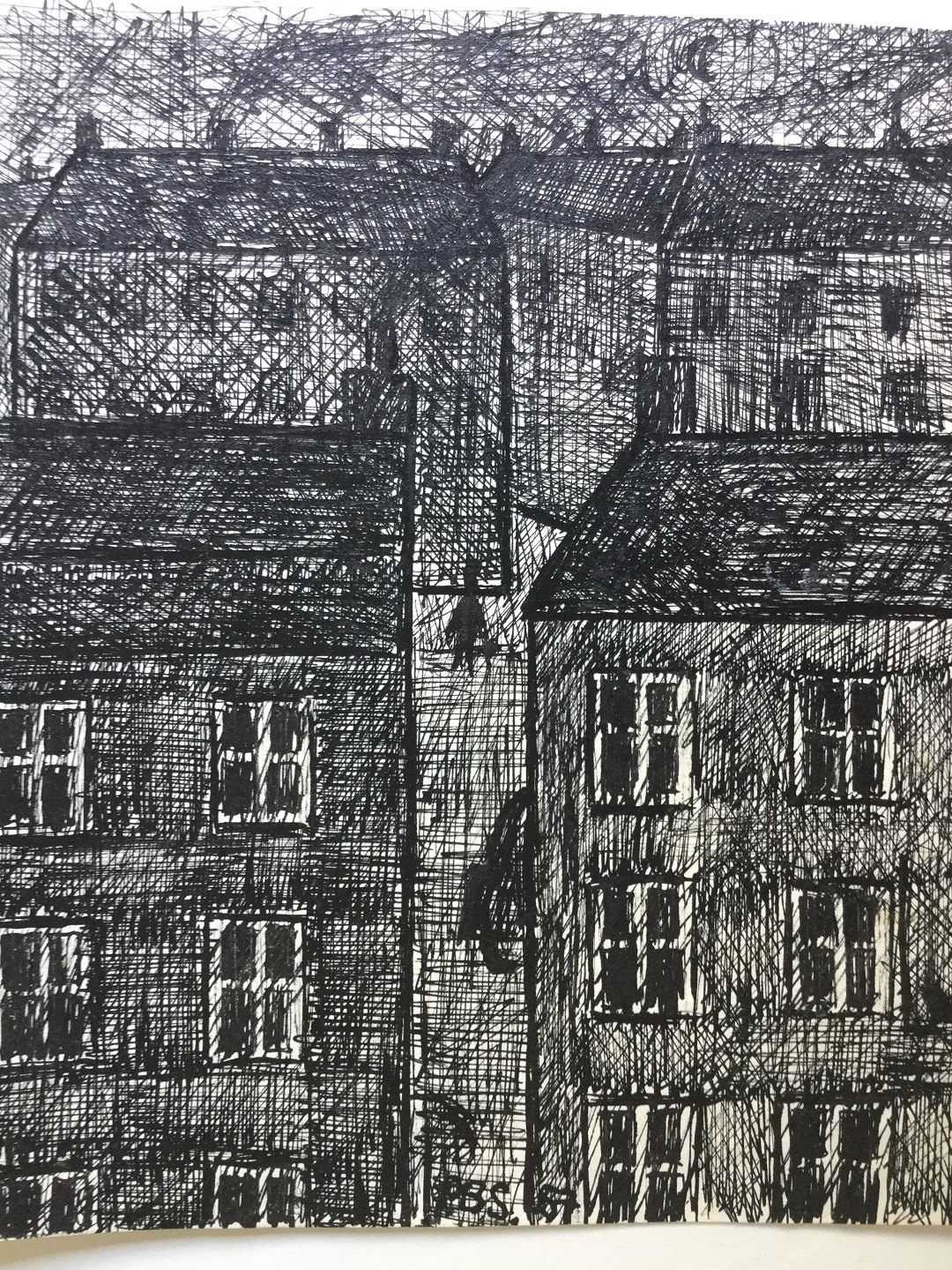 Tegning af Peder Brøndum Sørensen - Højhuse i byen 1967.