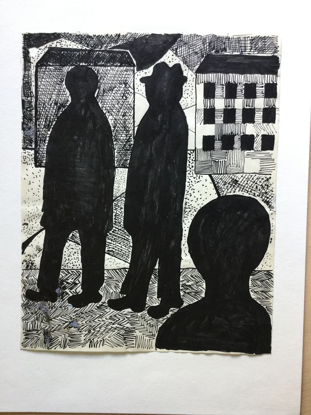 Tegning af Peder Brøndum Sørensen - 3 personer ved højhuse.
