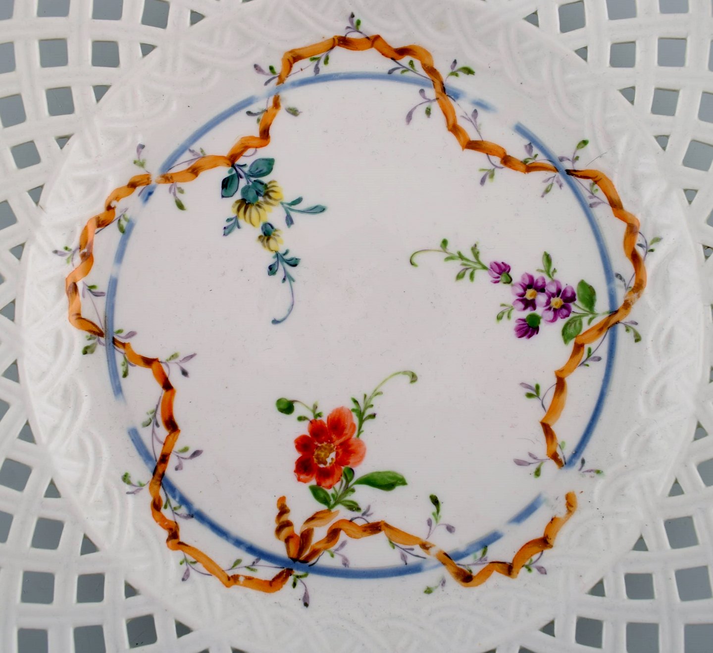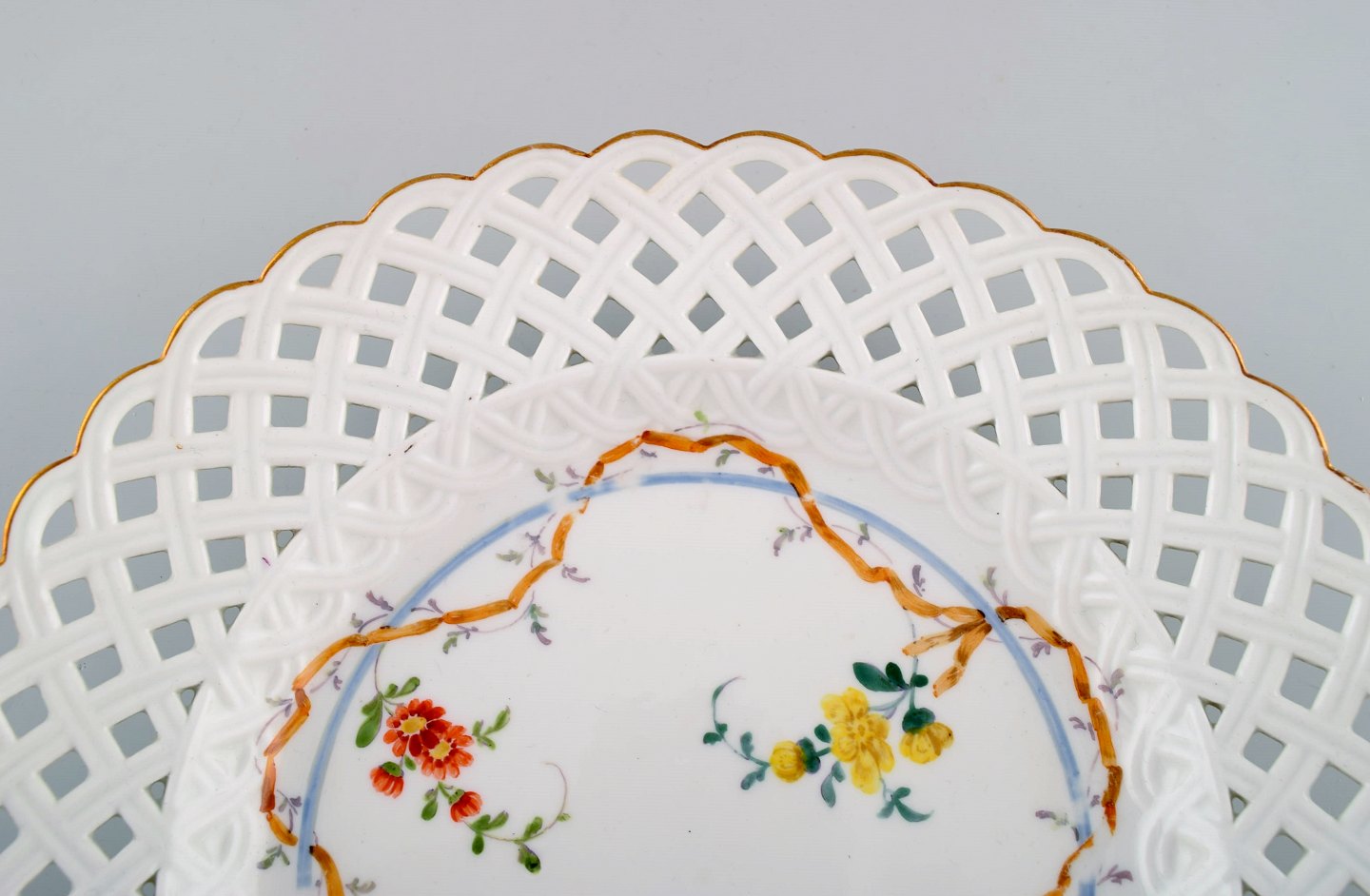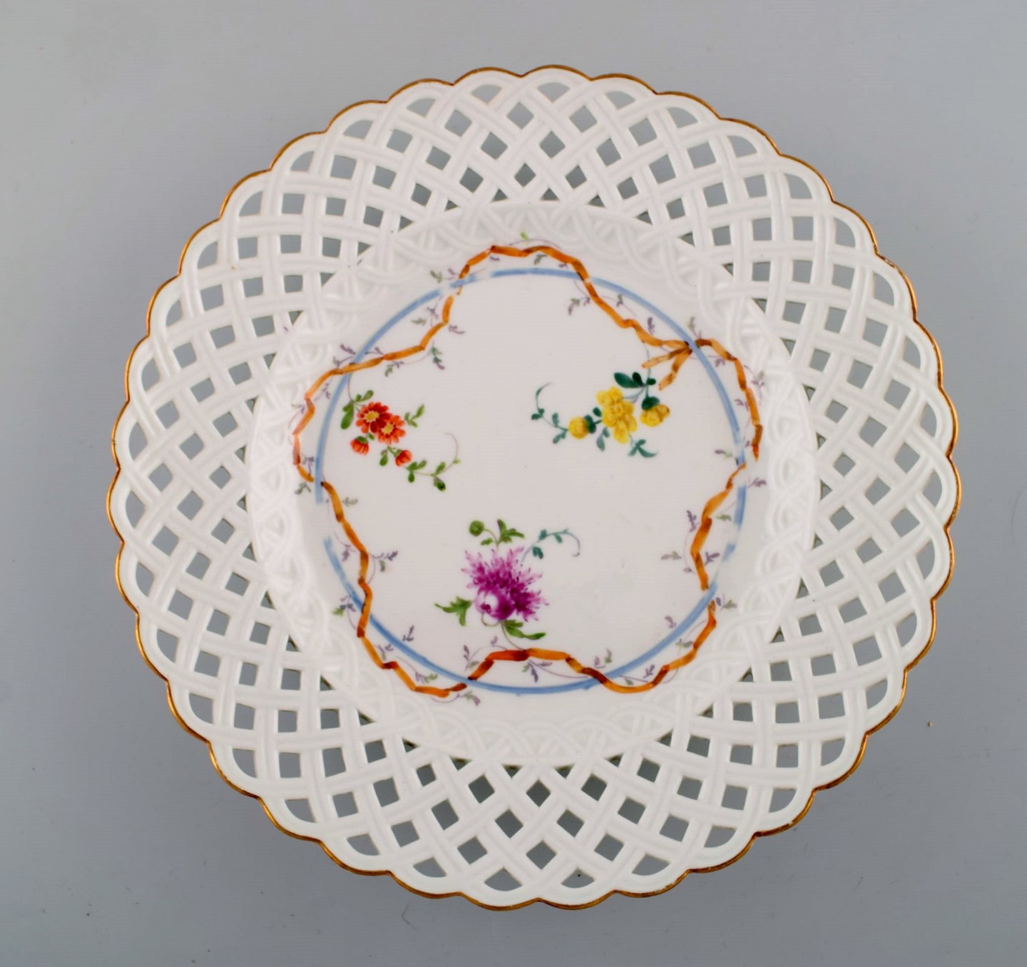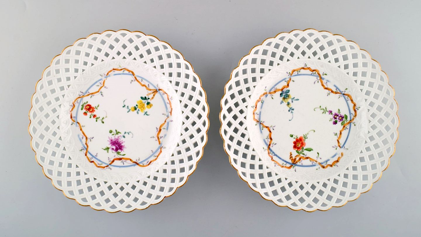 To antikke Meissen tallerkener i gennembrudt porcelæn med håndmalede blomster motiver. Museumskvalitet. Dateret 1773-1814.