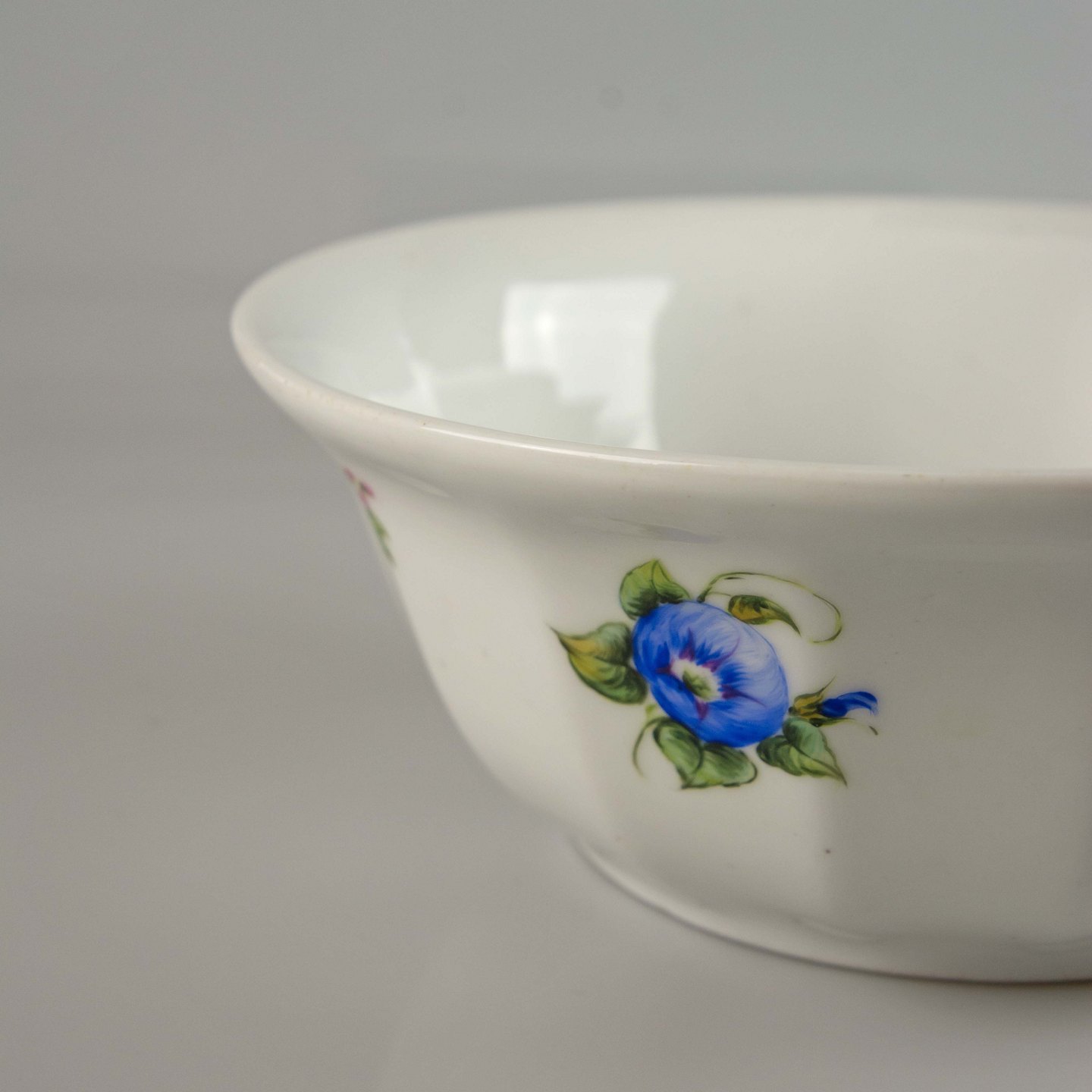 Antik kantet skål i porcelæn med forskellige blomster motiver.