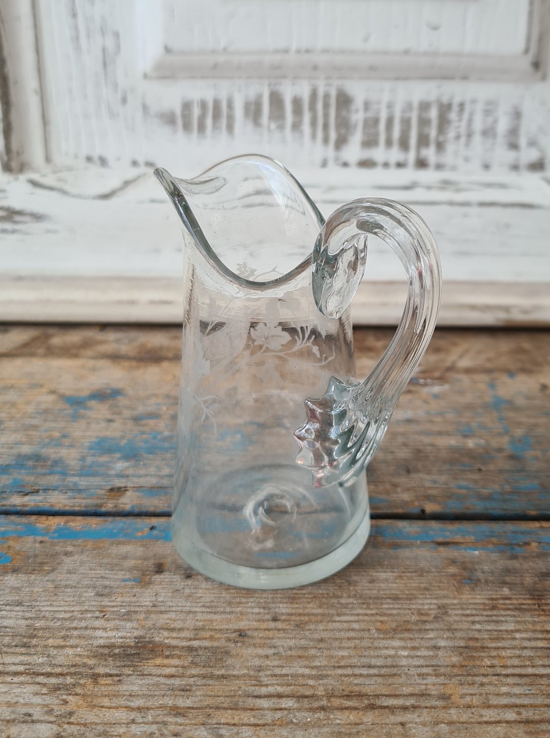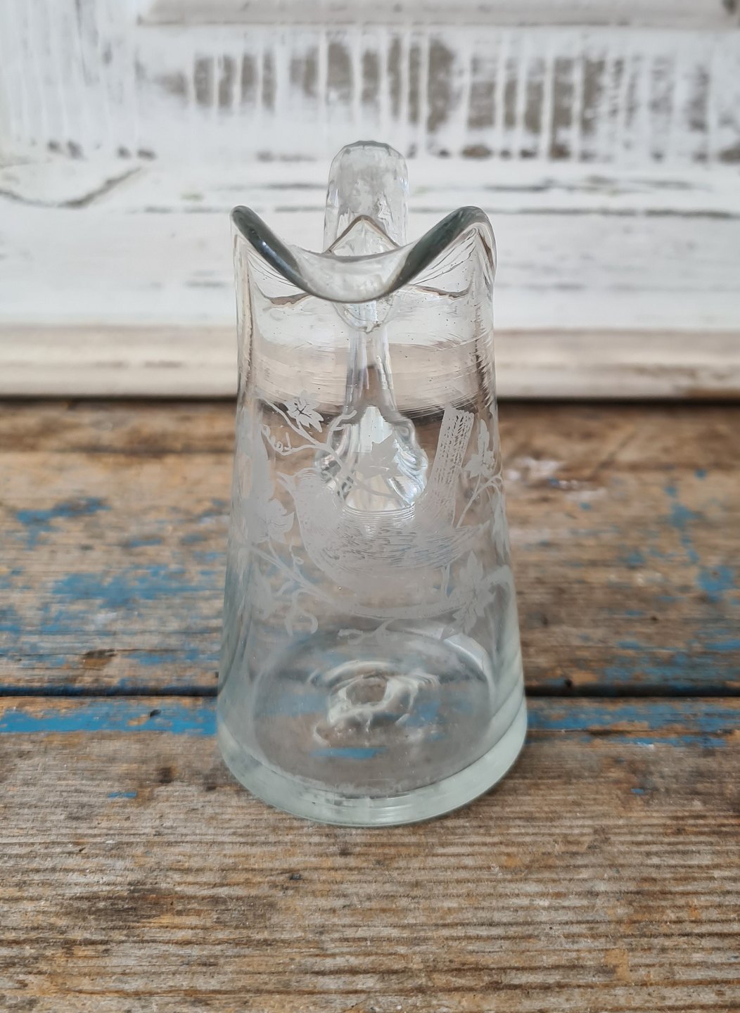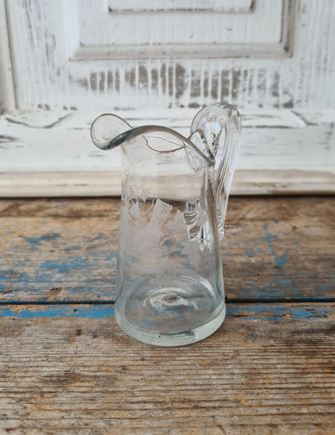 Kastrup Glasværk 1910 lille flødekande ætset dekoreret med fugl.
