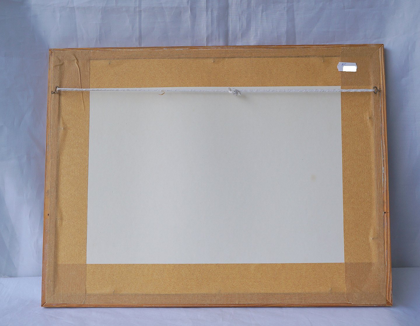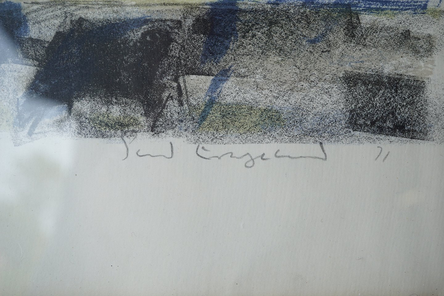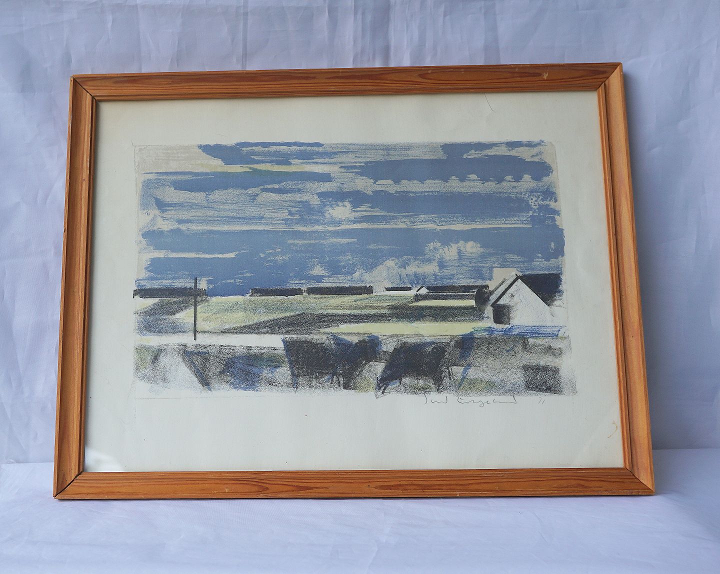 Skue over marker og gårde med blå himmel, litografi af Svend Engelund.