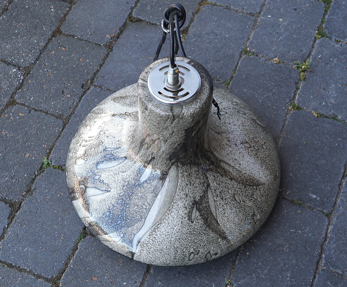 Svensk Orrefors pendel. Dekorationen udvendig, kan være inspireret af et slangeskind. Pendlen er af glas og hvid indvendig