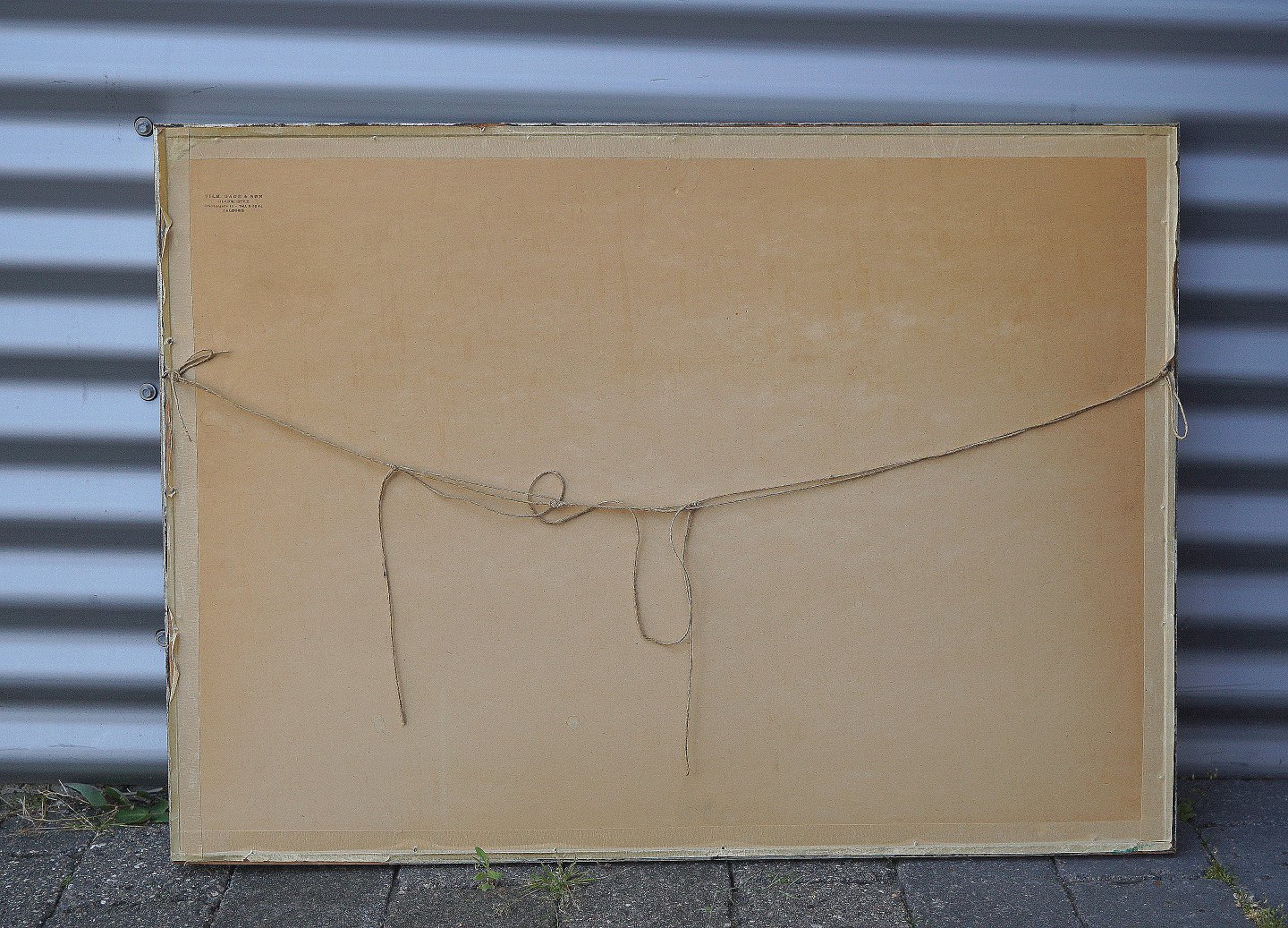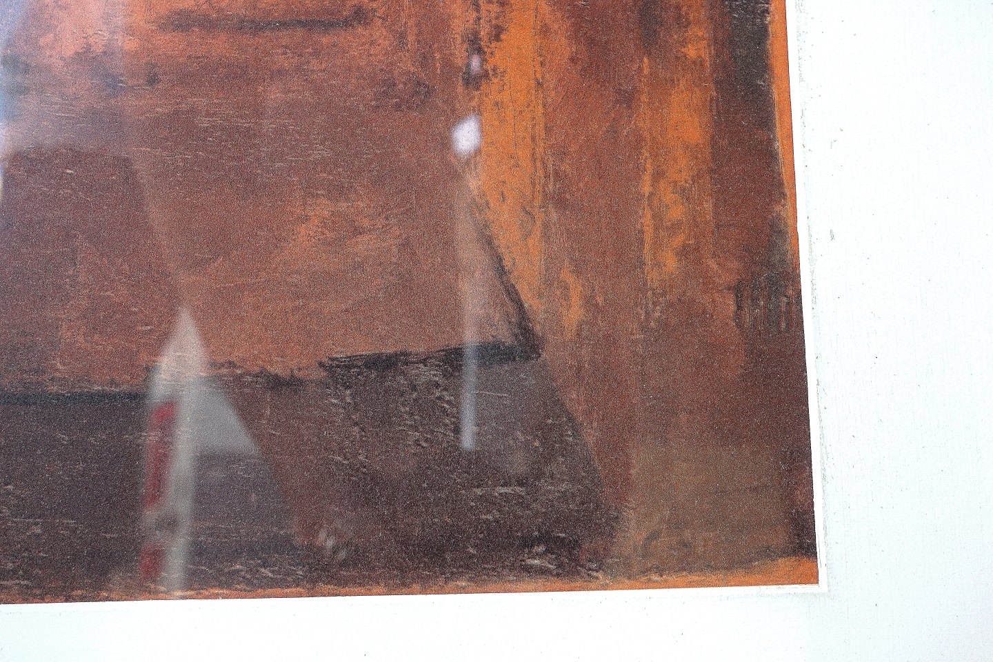 Indrammmet tryk sølvmalet træramme med abstrakt motiv i brune, og orange nuancer