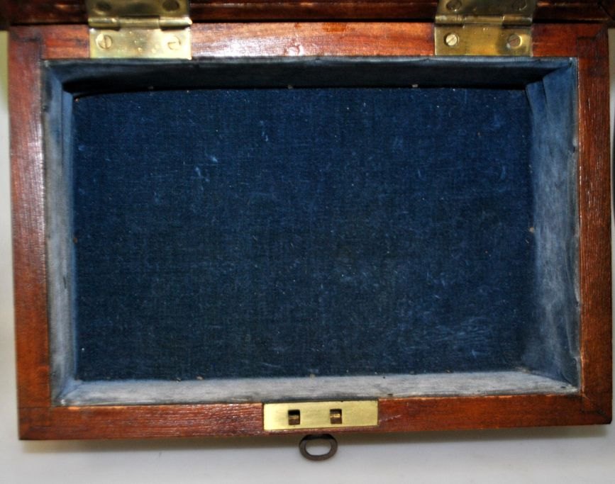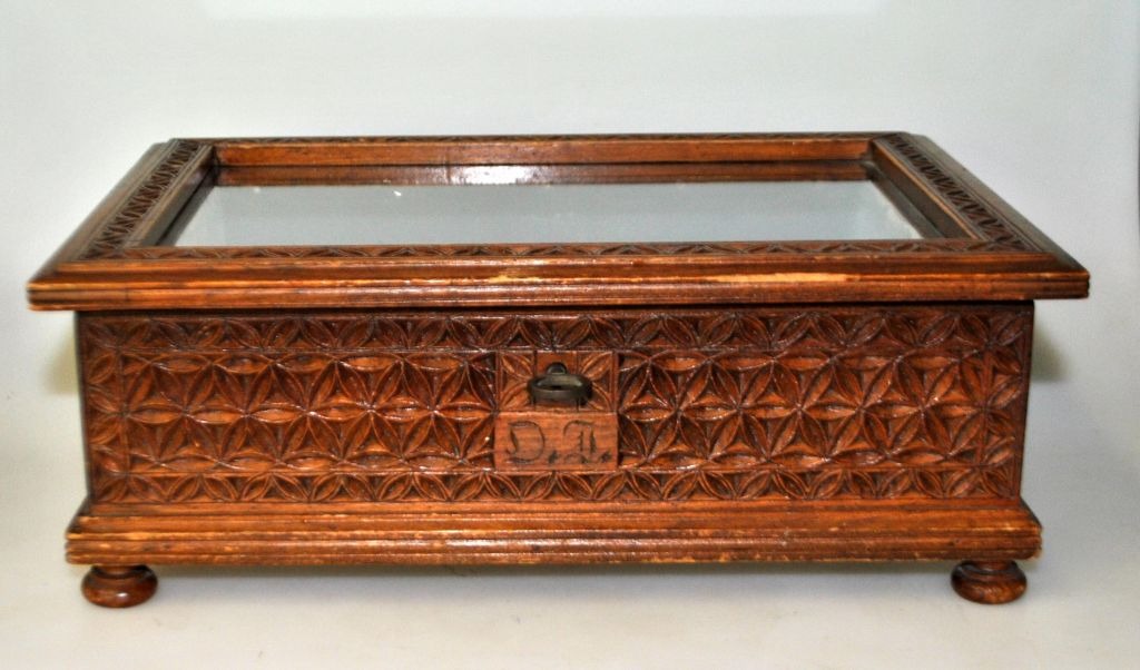Karv skåret smykkeskrin. Låg med glas, 19. årh. Danmark. Med lås og nøgle. Med initialerne: D.J. Indvendig foret med stof. 28,5 x 20 x 10 cm.