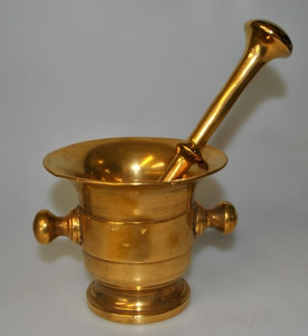 Messing morter med pistil og to hanke, 19. årh. Ustemplet. Højde.: 9 cm. Længde pistil: 19 cm.