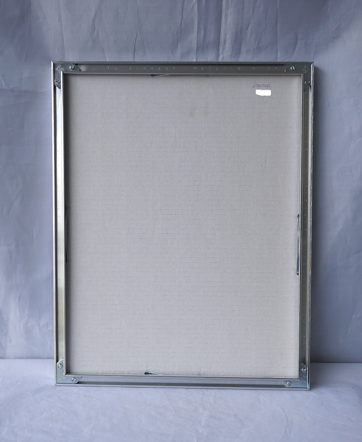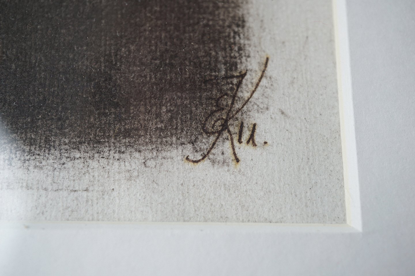 Indrammet litografi i aluminiumsramme med abstrakt motiv af et orange ansigt, der kommer ud af mørket