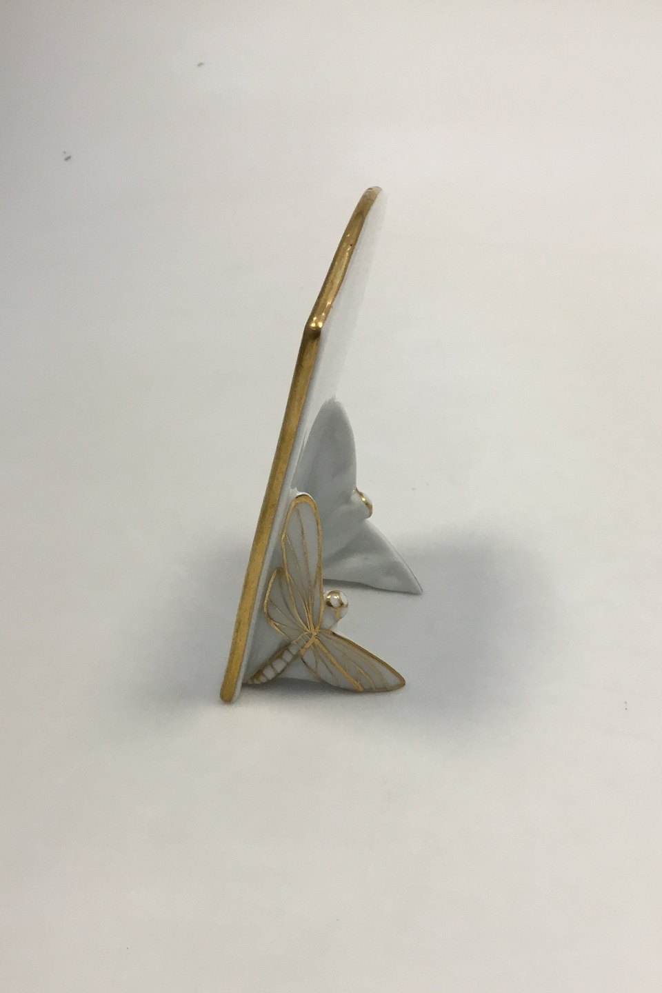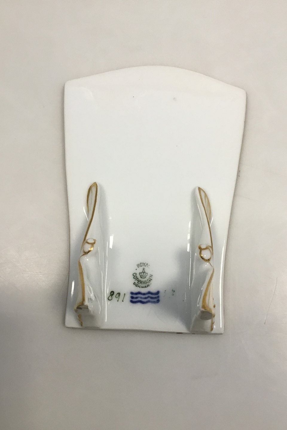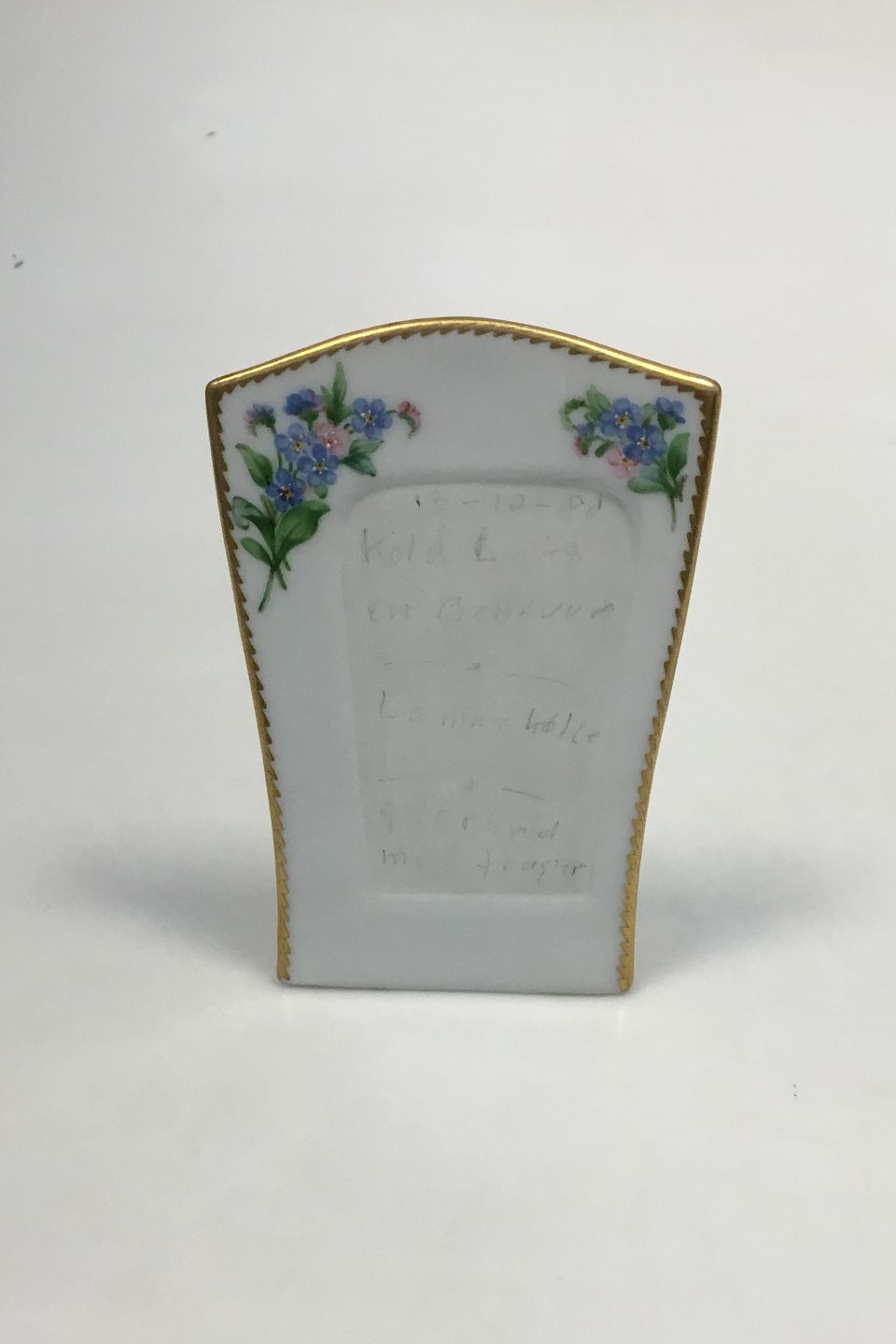 Royal Copenhagen Menuskilt til bord No 891. Dekoreret med blomster, takket guldkant og guldsmede. Måler 13 cm