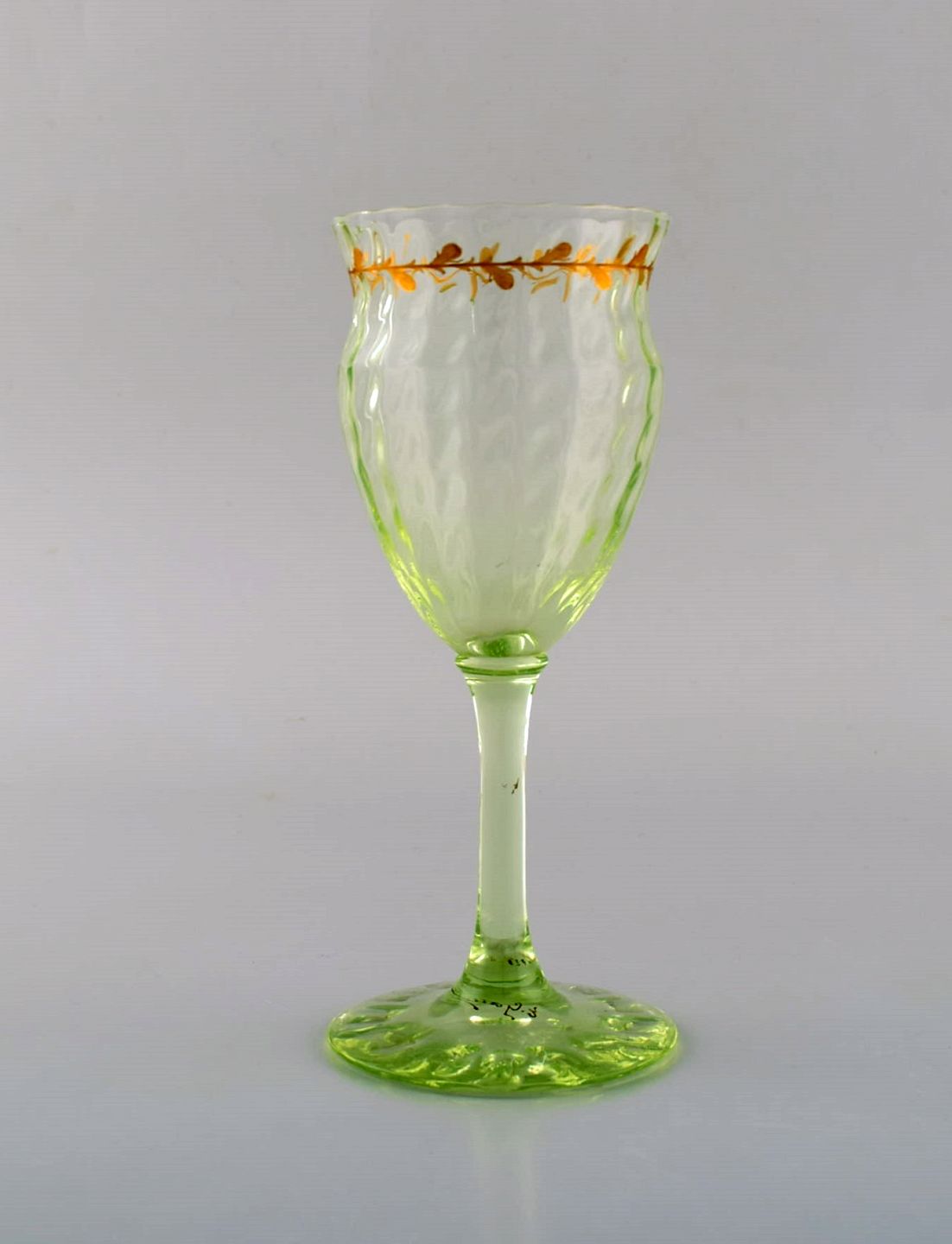 Emile Gallé (1846-1904). Tidligt og sjældent vinglas i mundblæst lysegrønt kunstglas med håndmalede guldekorationer i form af blade. Museumskvalitet, 1870/80'erne.