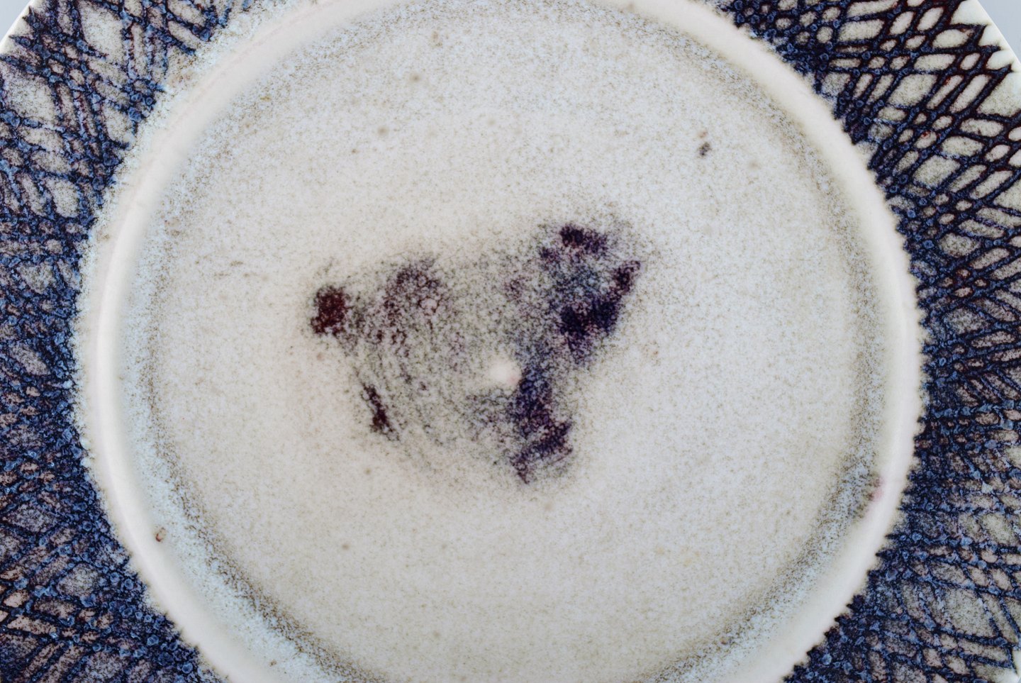 Stig Lindberg for Gustavsberg Studiohand. Stort fad i glaseret keramik. Smuk glasur i violette toner. Svensk design, midt 1900-tallet.