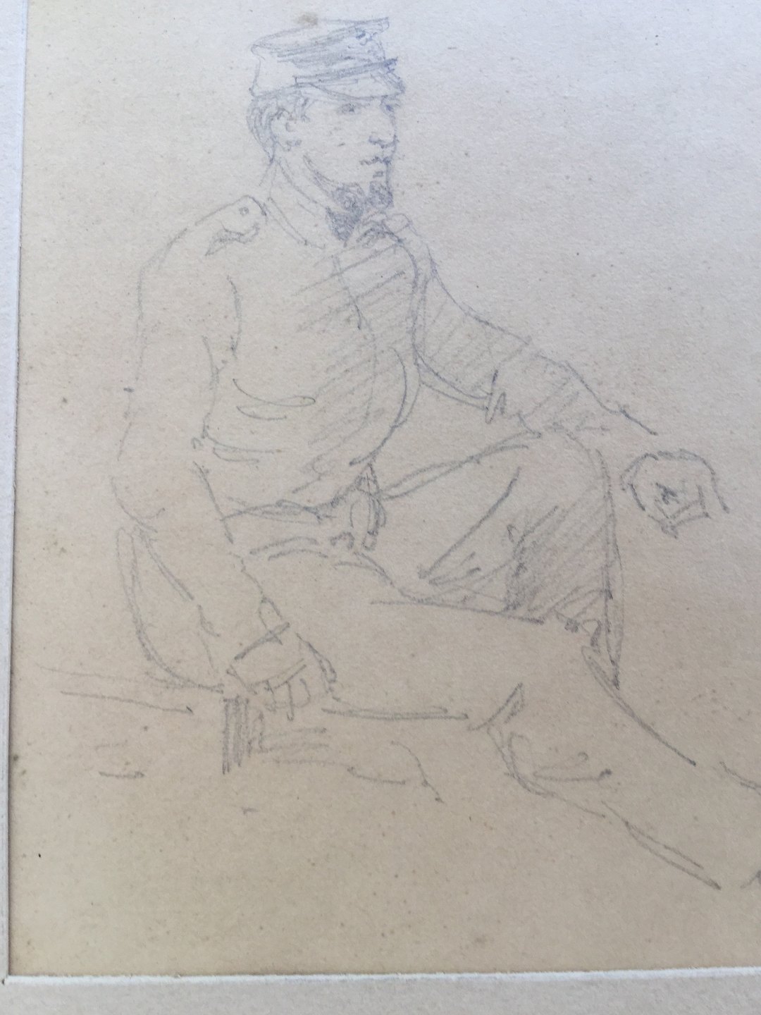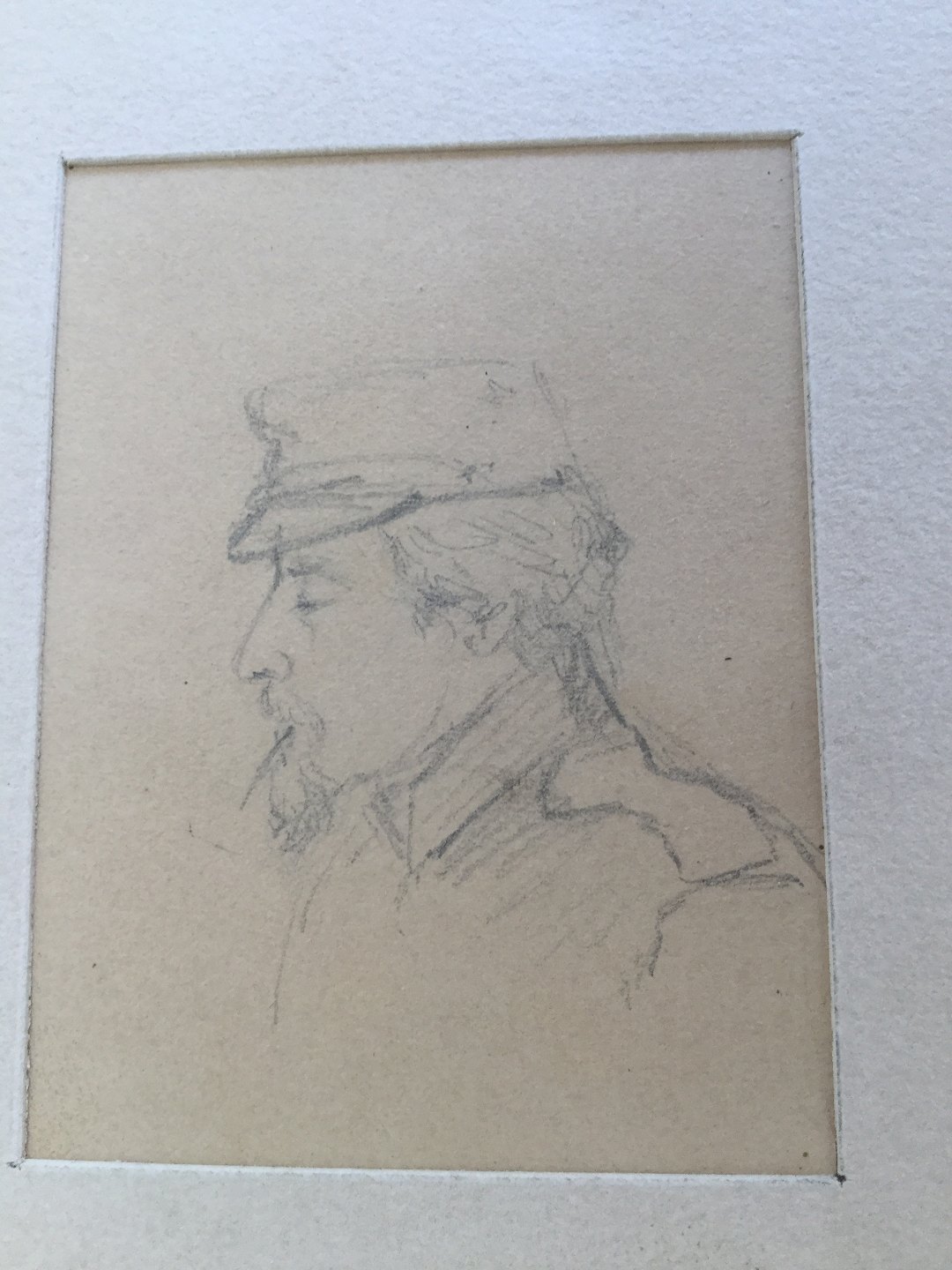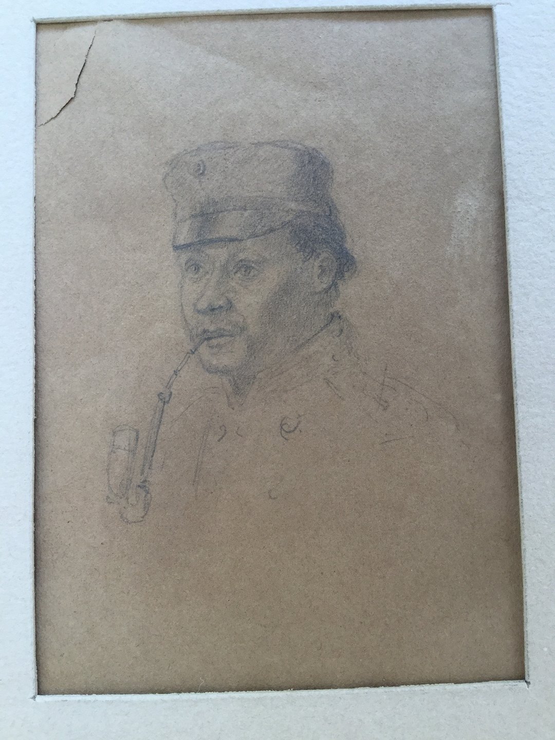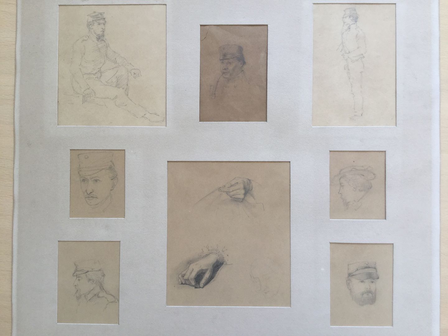 Portrætter og helfigur af soldaterkammerater fra krigen i 1864 samt et studie af kvindehænder.