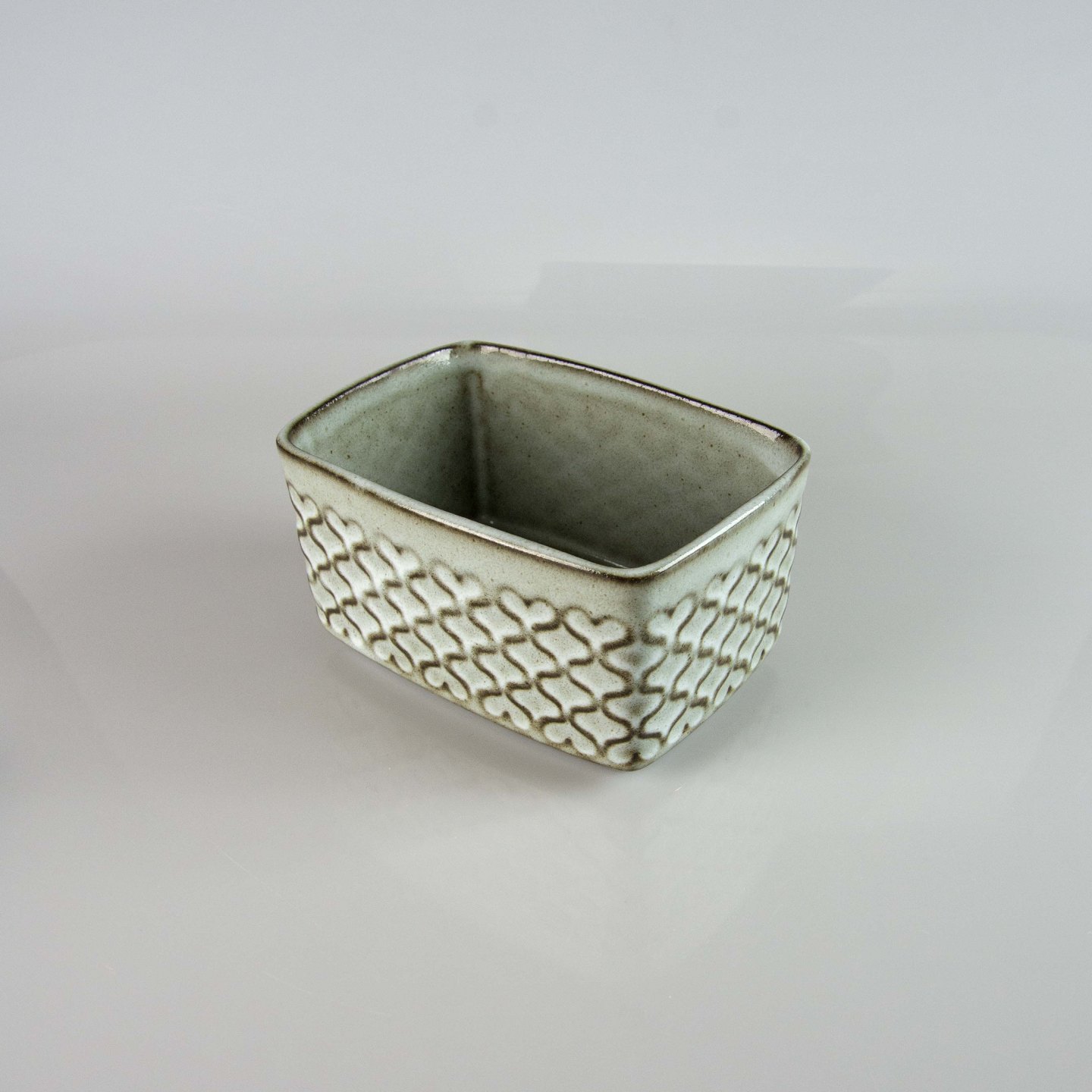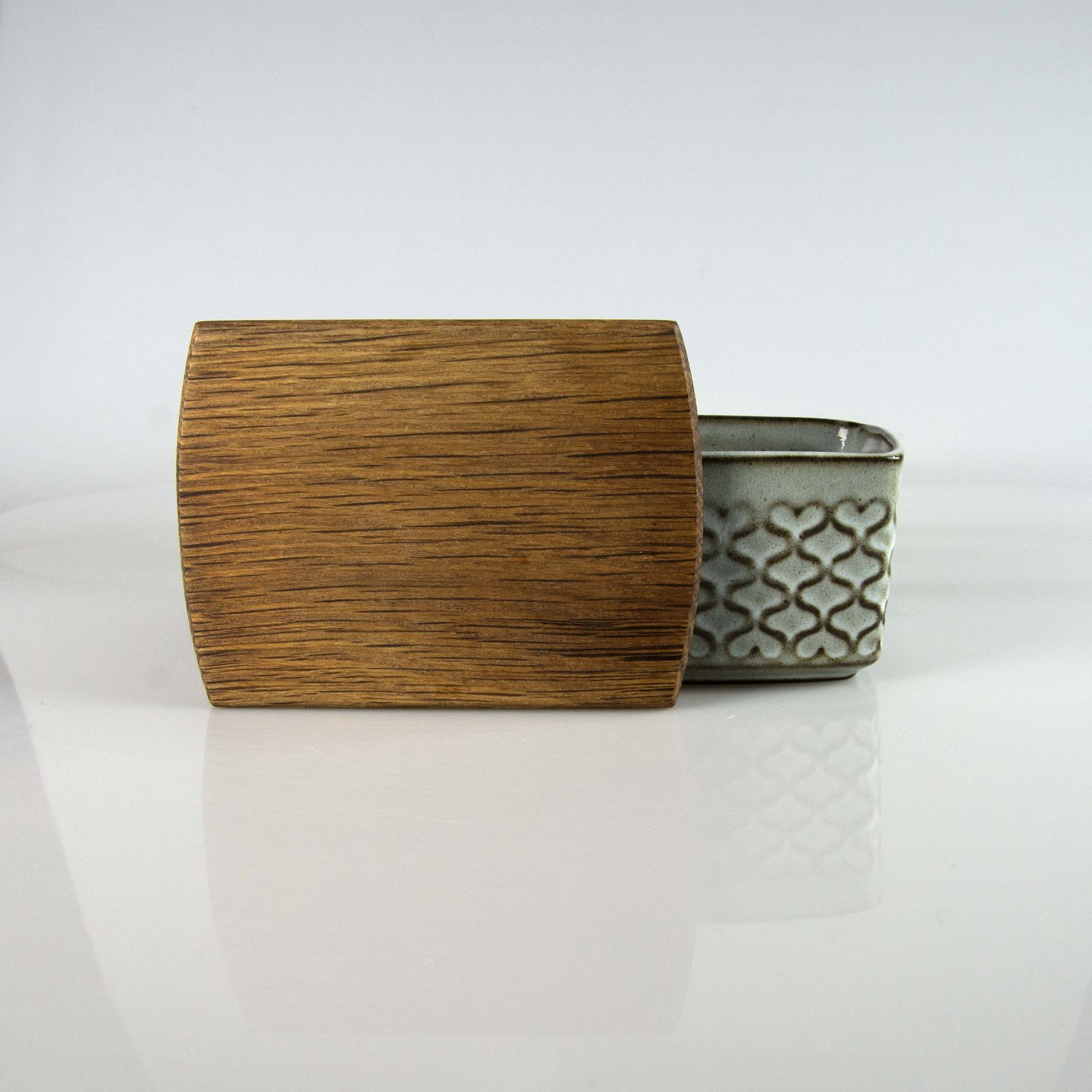 Text available in Danish: Smørboks i stentøj med trælåg fra stellet Grå cordial