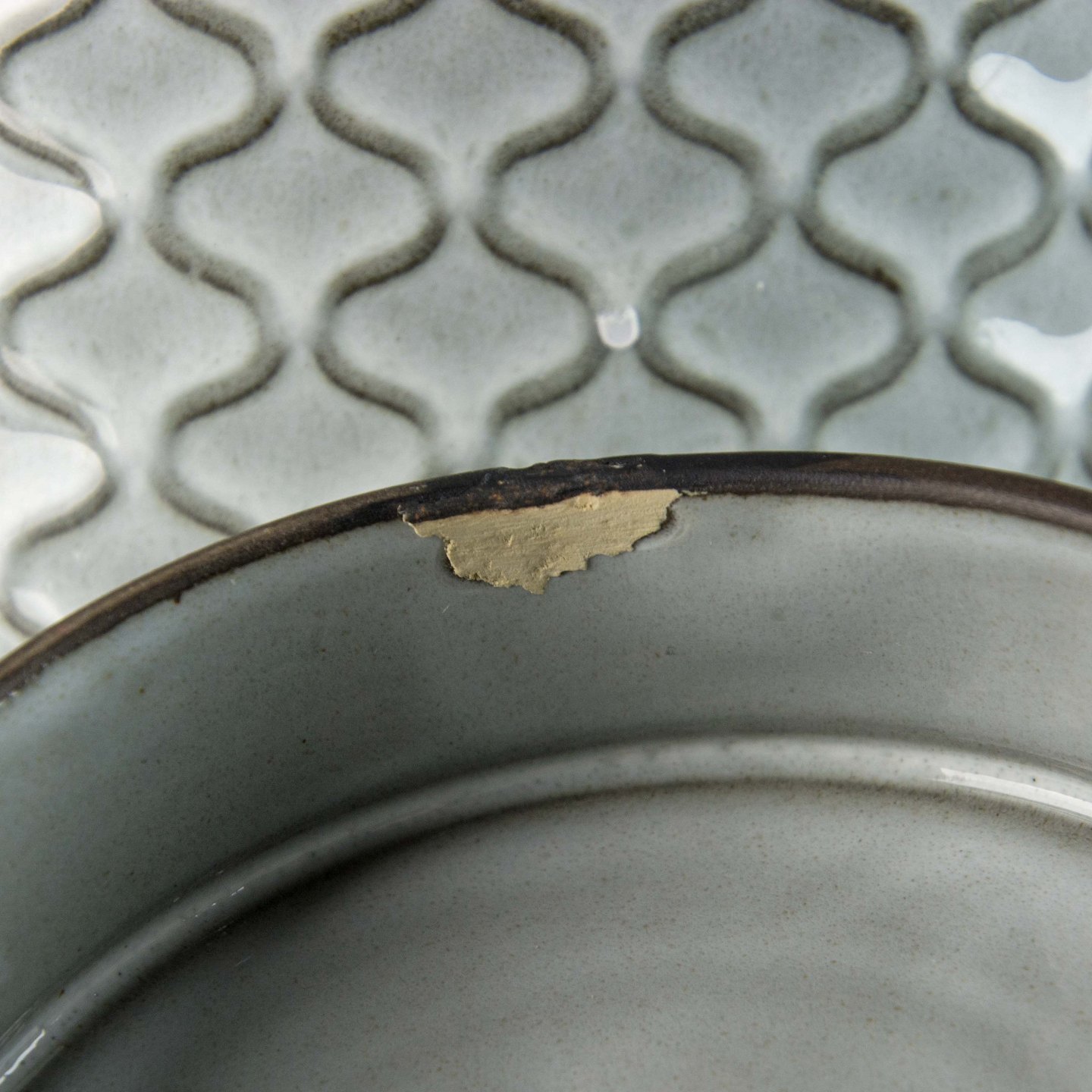 Pæn stand. Mindre område på indvendige side af låg er klinket.