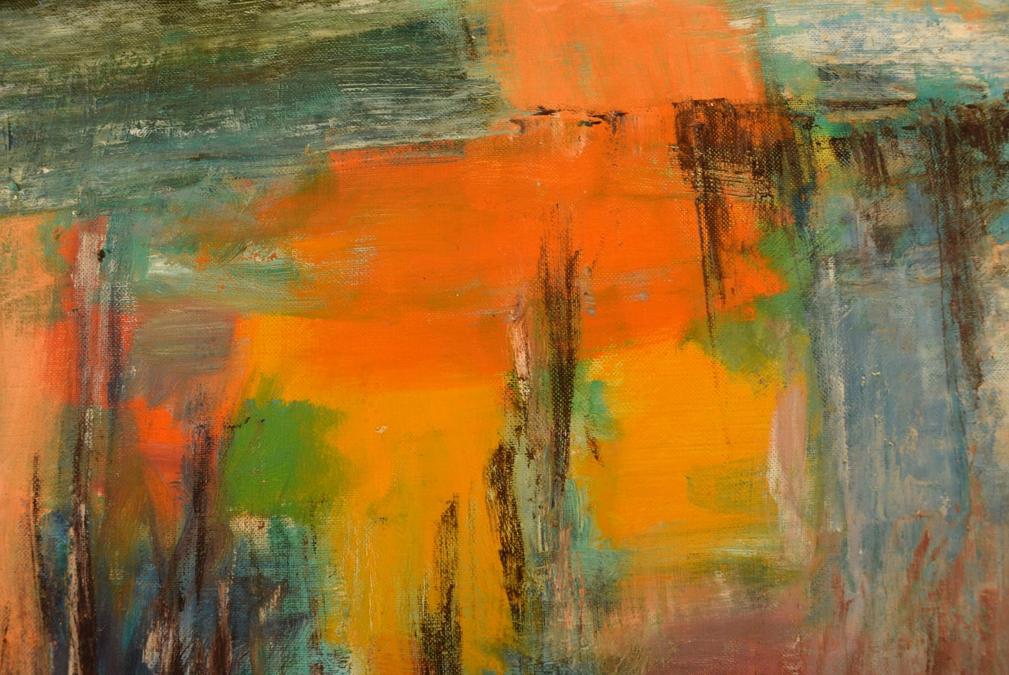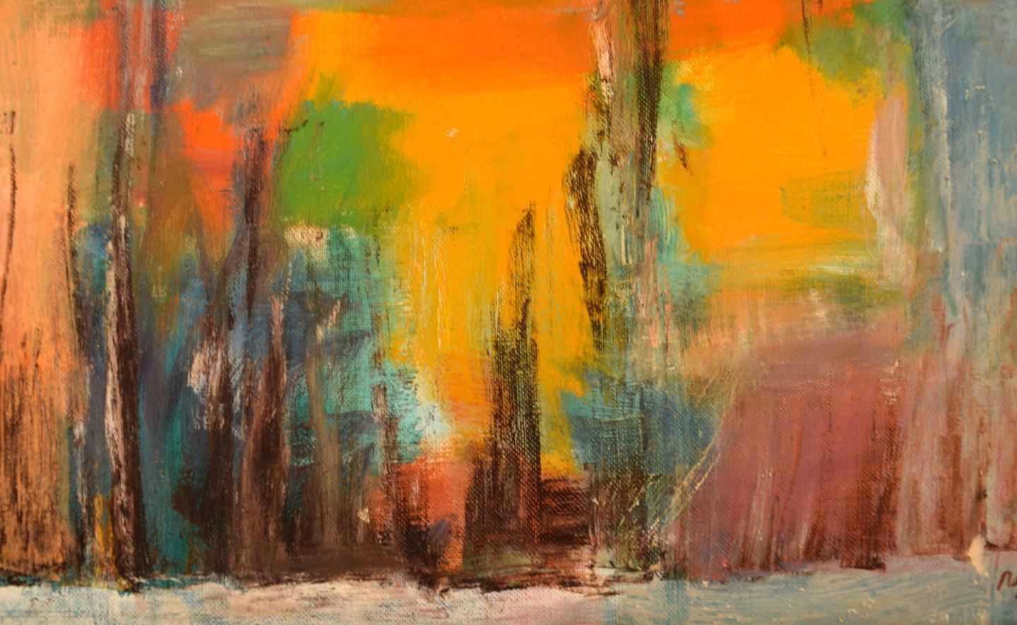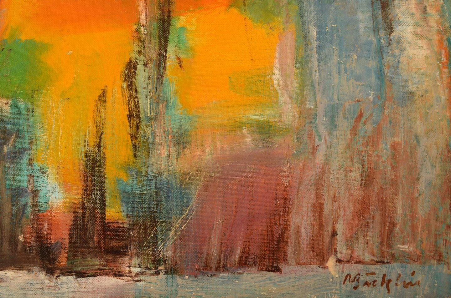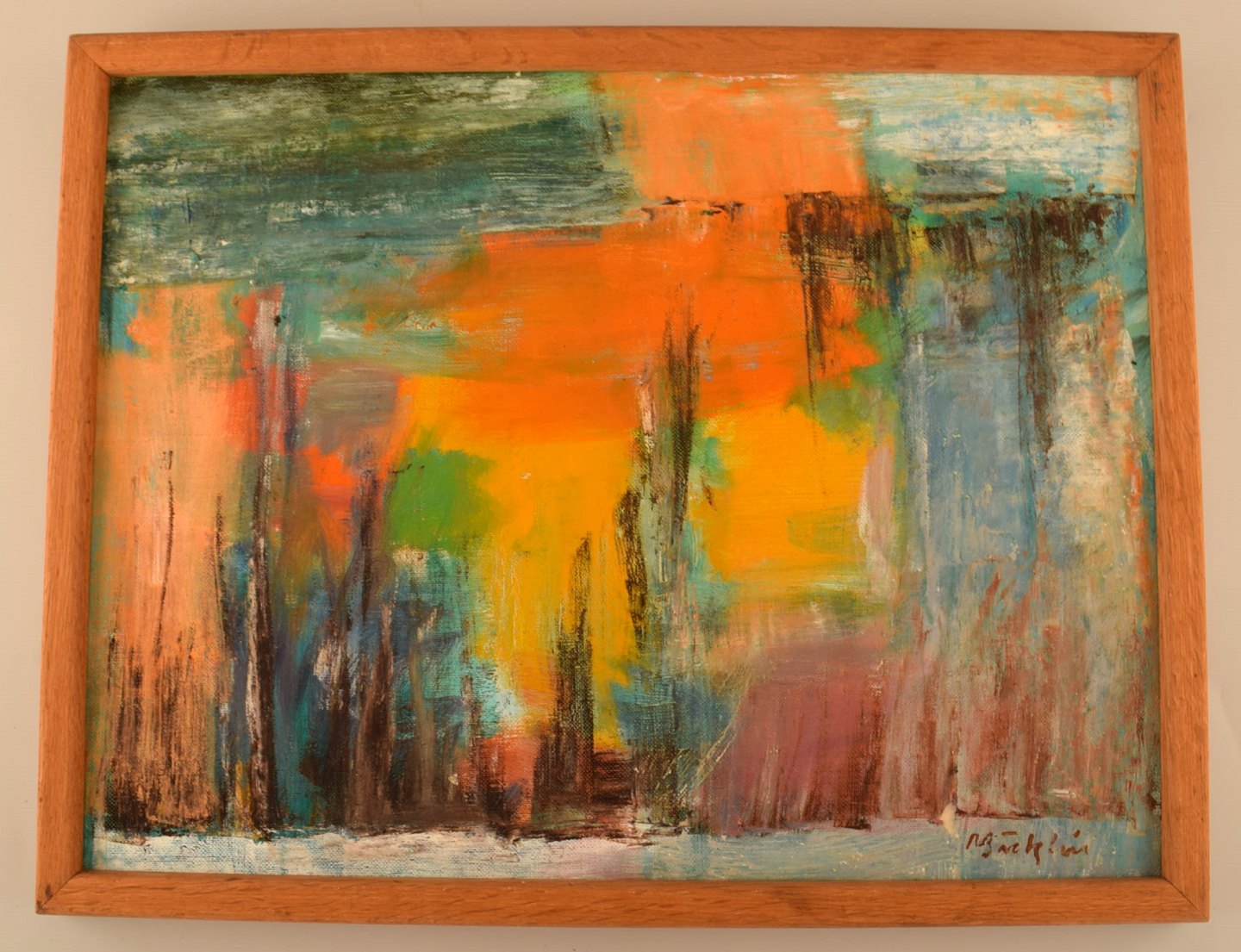 Niels Bäcklin (1913-1989), svensk kunstner. Olie på lærred. Modernistisk landskab med solnedgang. 1960/70'erne.