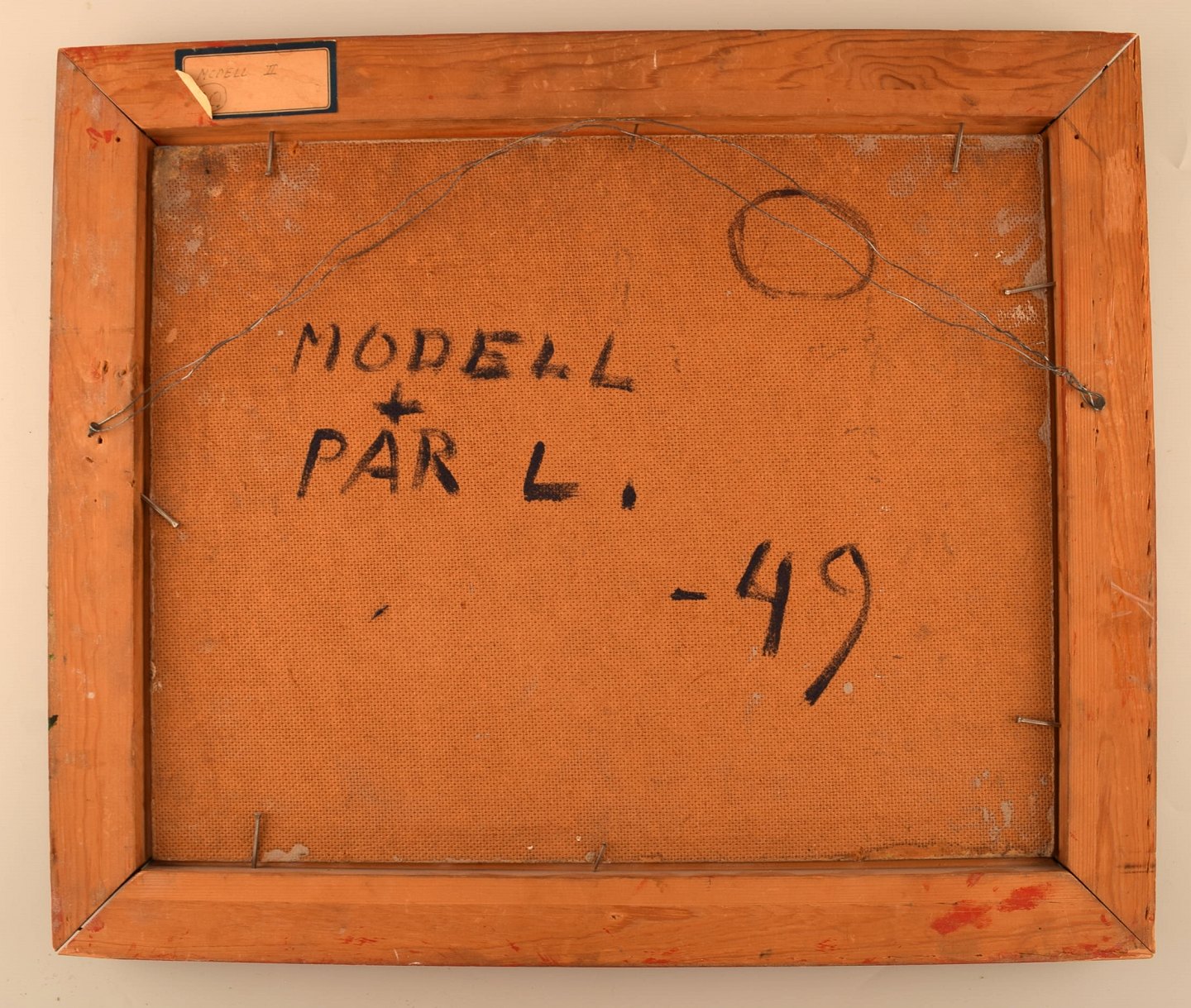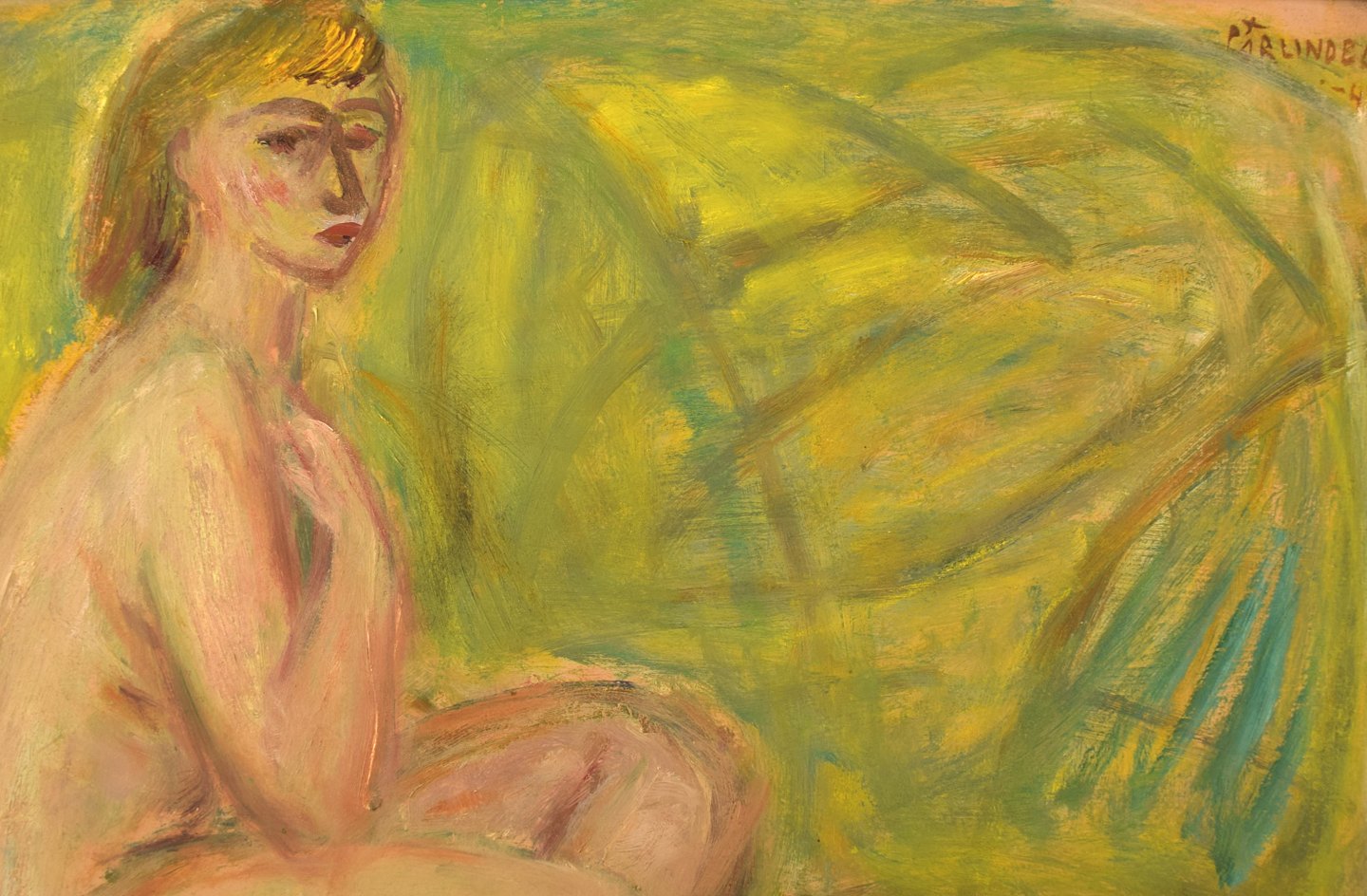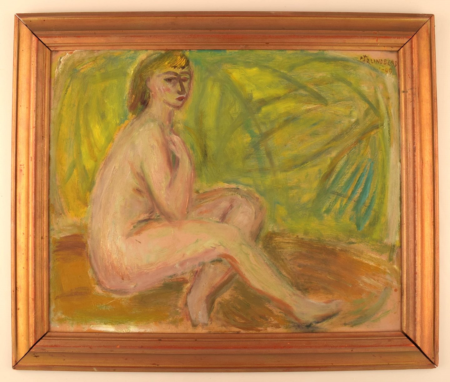 Pär Lindblad (f. 1907, d.1981), svensk kunstner. Olie på plade. "Modell". Nøgen kvinde. Dateret 1949.