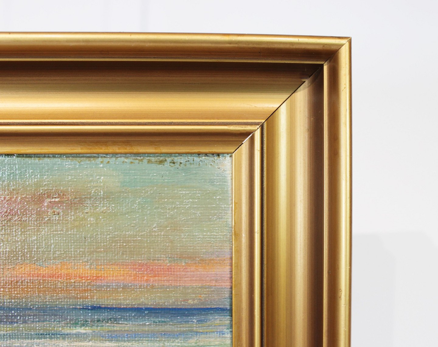 Maleri med motiv af solnedgang og med guld ramme signeret H. Ellemann.