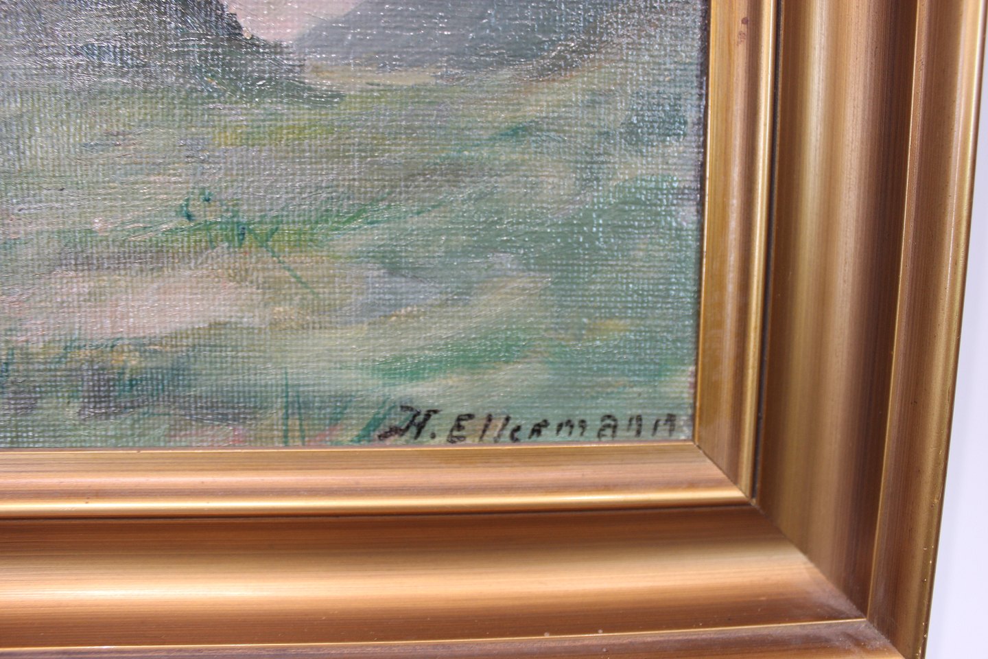 Maleri med motiv af solnedgang og med guld ramme signeret H. Ellemann. Maleriet er i flor brugt stand.