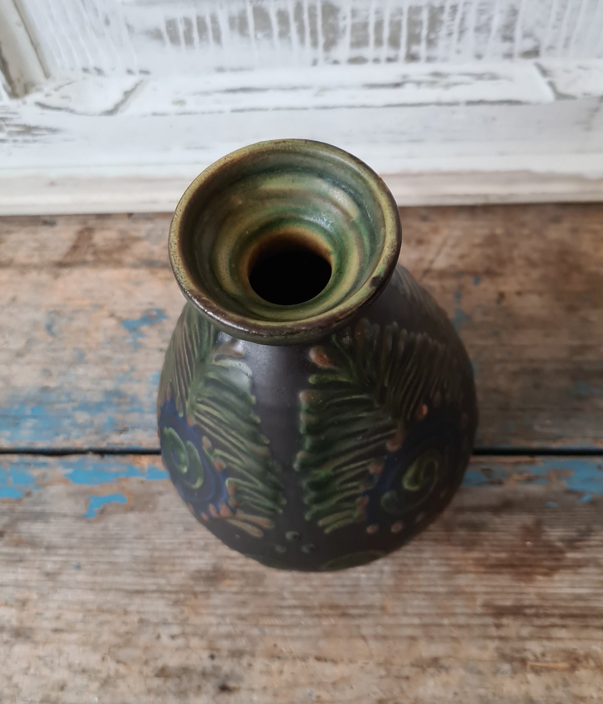 Kähler vase - kohorns dekoreret i blå, grøn og brune farver.