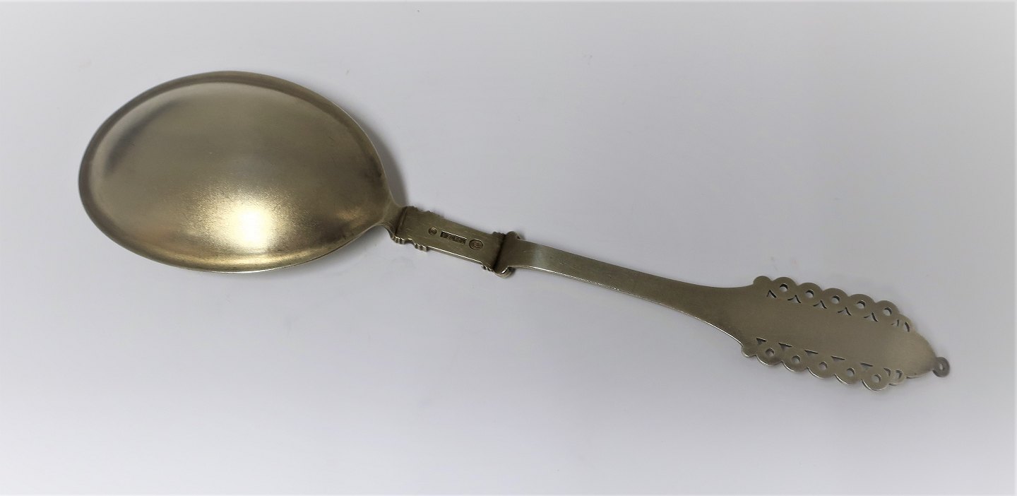 V. Berth. Sølv serveringsske (830) forgyldt. Længde 27,5 cm. Produceret 1897.