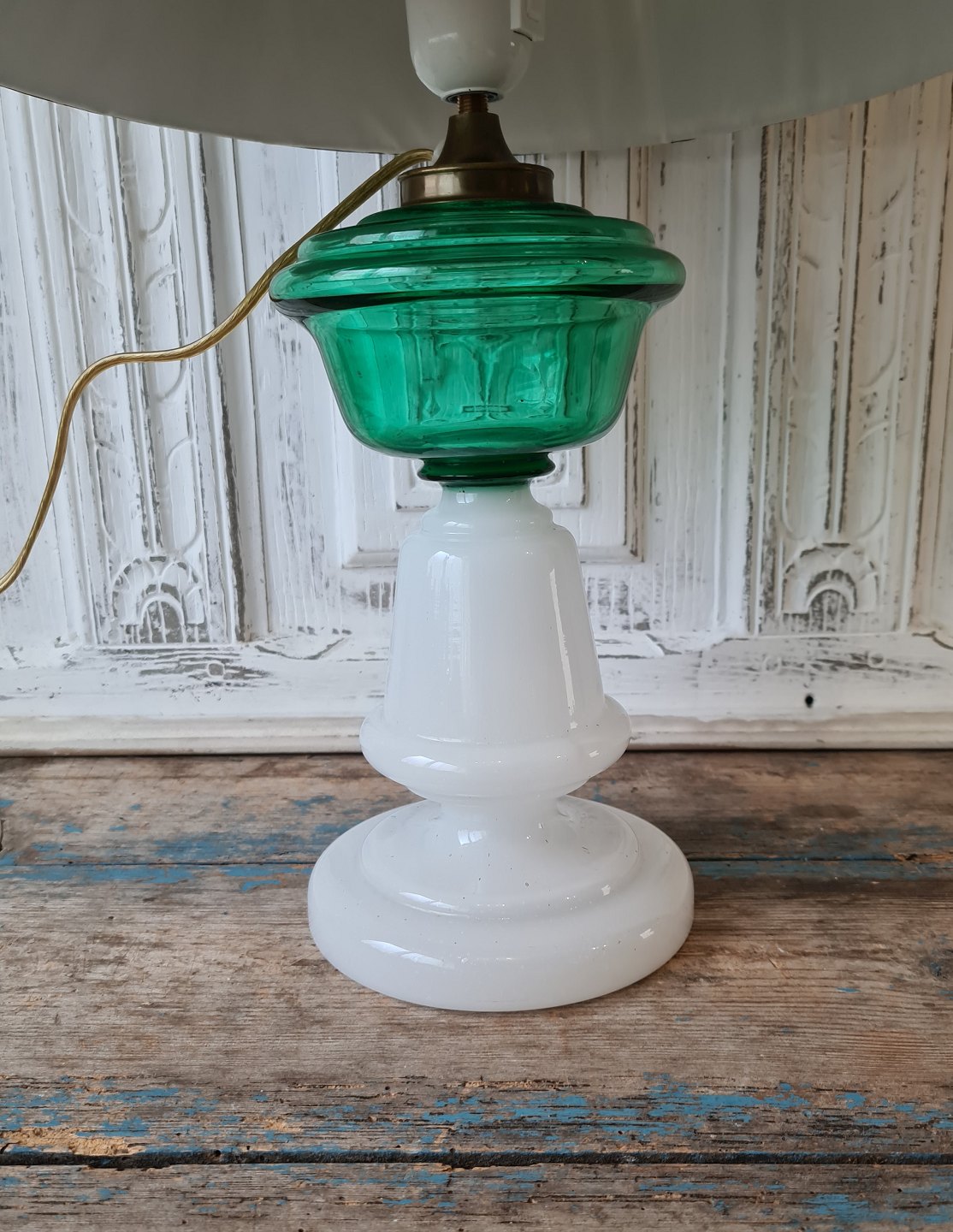 Smuk opaline olielampe med oliebehoder i smaragdgrønt glas, omlavet til el.