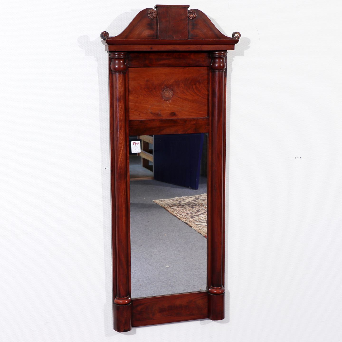 Spejl i ramme af fineret og lakeret mahogni, OBS mgl. roset i midten,