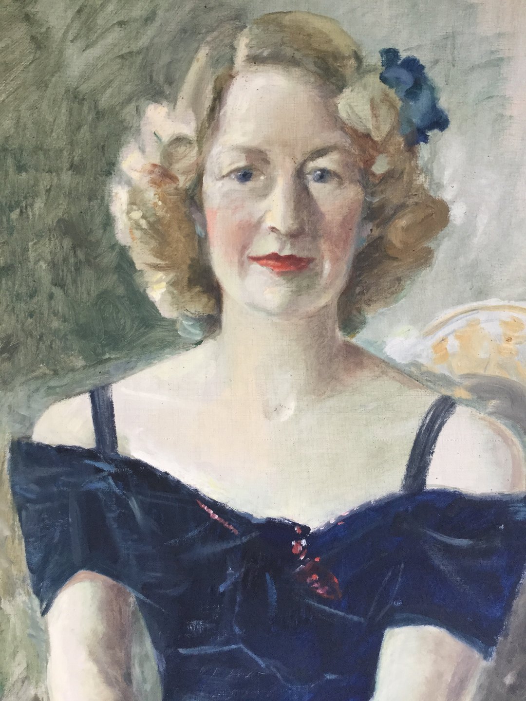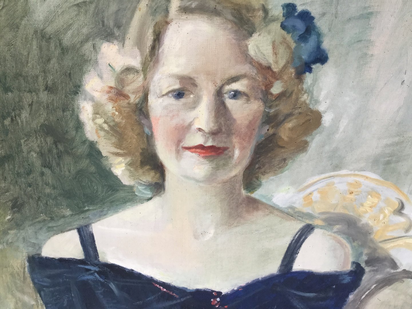 Helfigurs portræt af siddende kvinde i selskabstøj 1941.