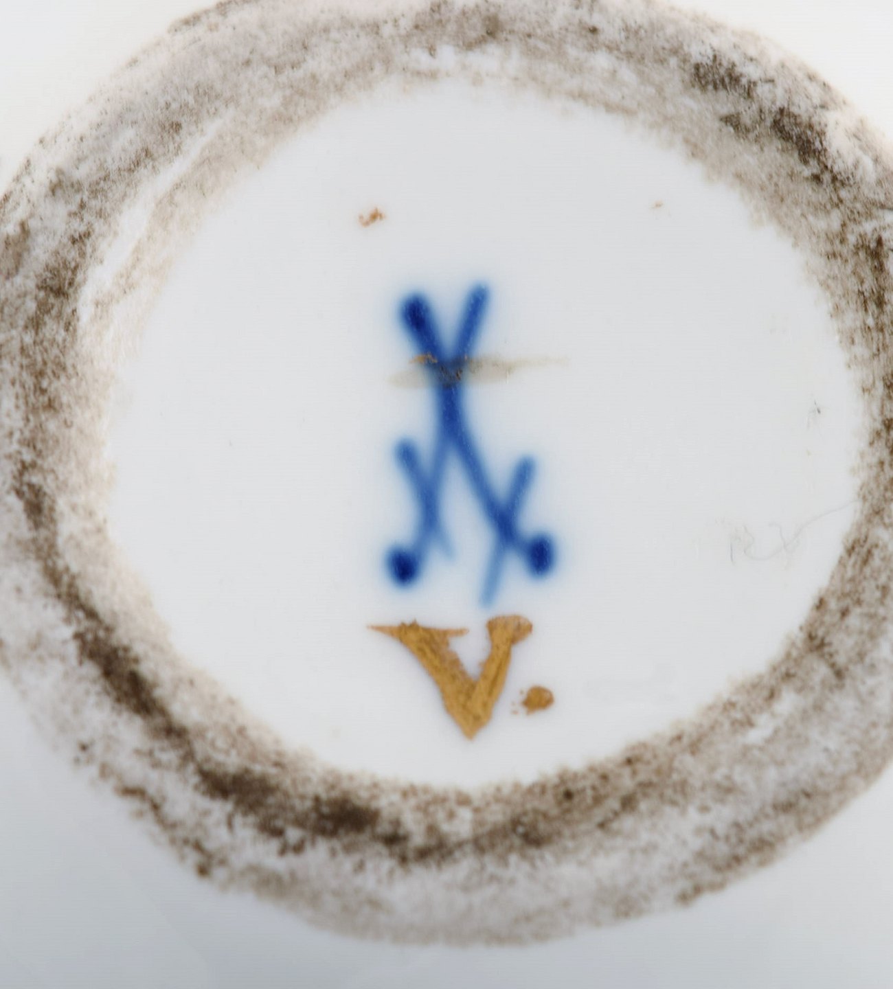 Antik Meissen lågkrukke i håndmalet porcelæn med romantisk scene og gulddekoration. 1800-tallet.