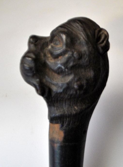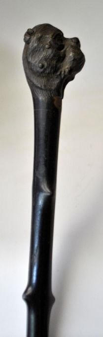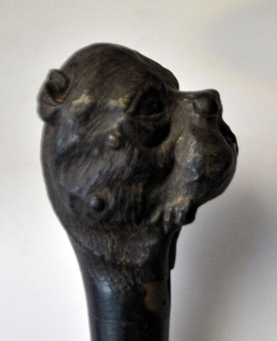 Walking stick in dark wood with handle with cut of bulldog, 19th century.