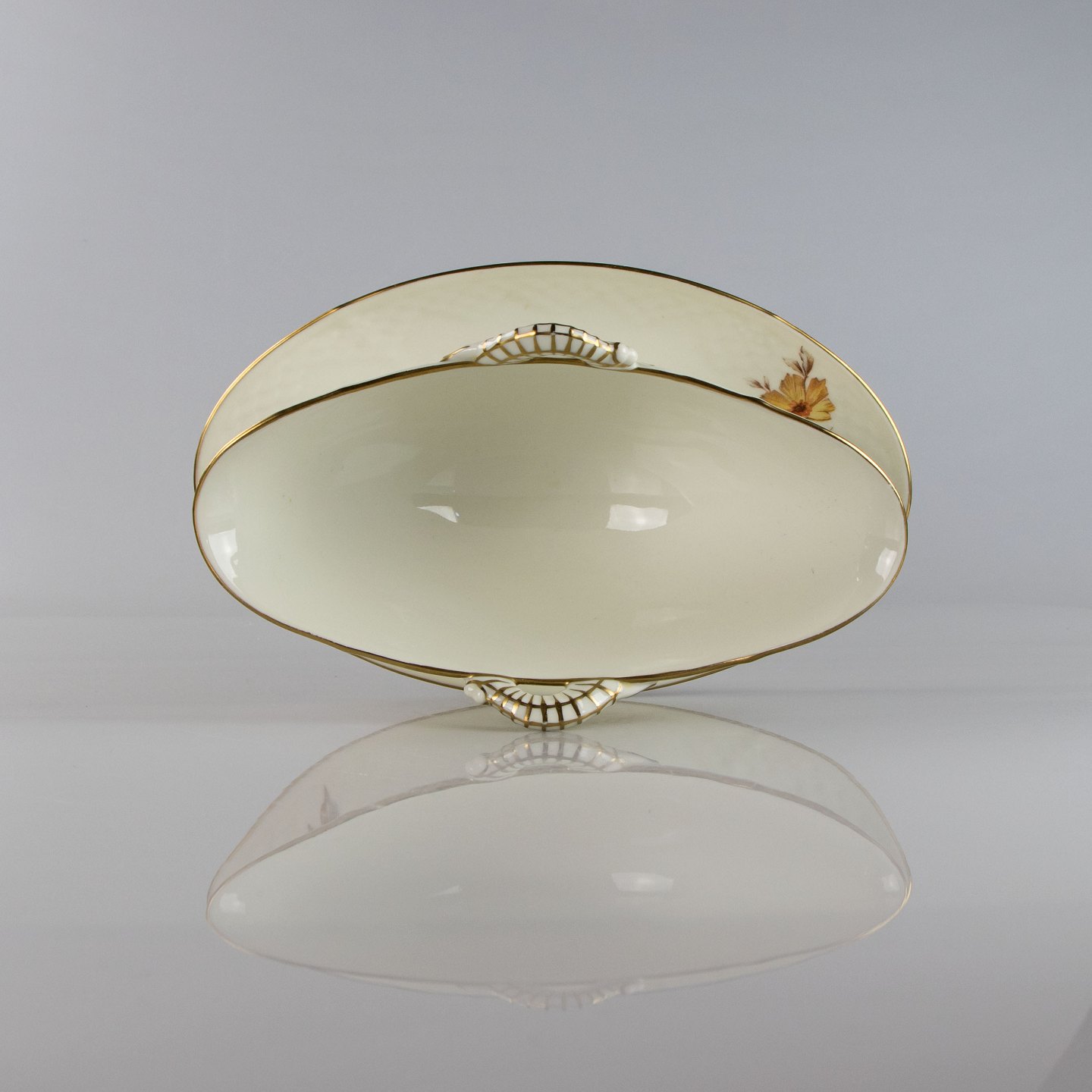 Sovseskål i cremefarvet porcelæn med skælmønster og guldkant med blomstermotiv.