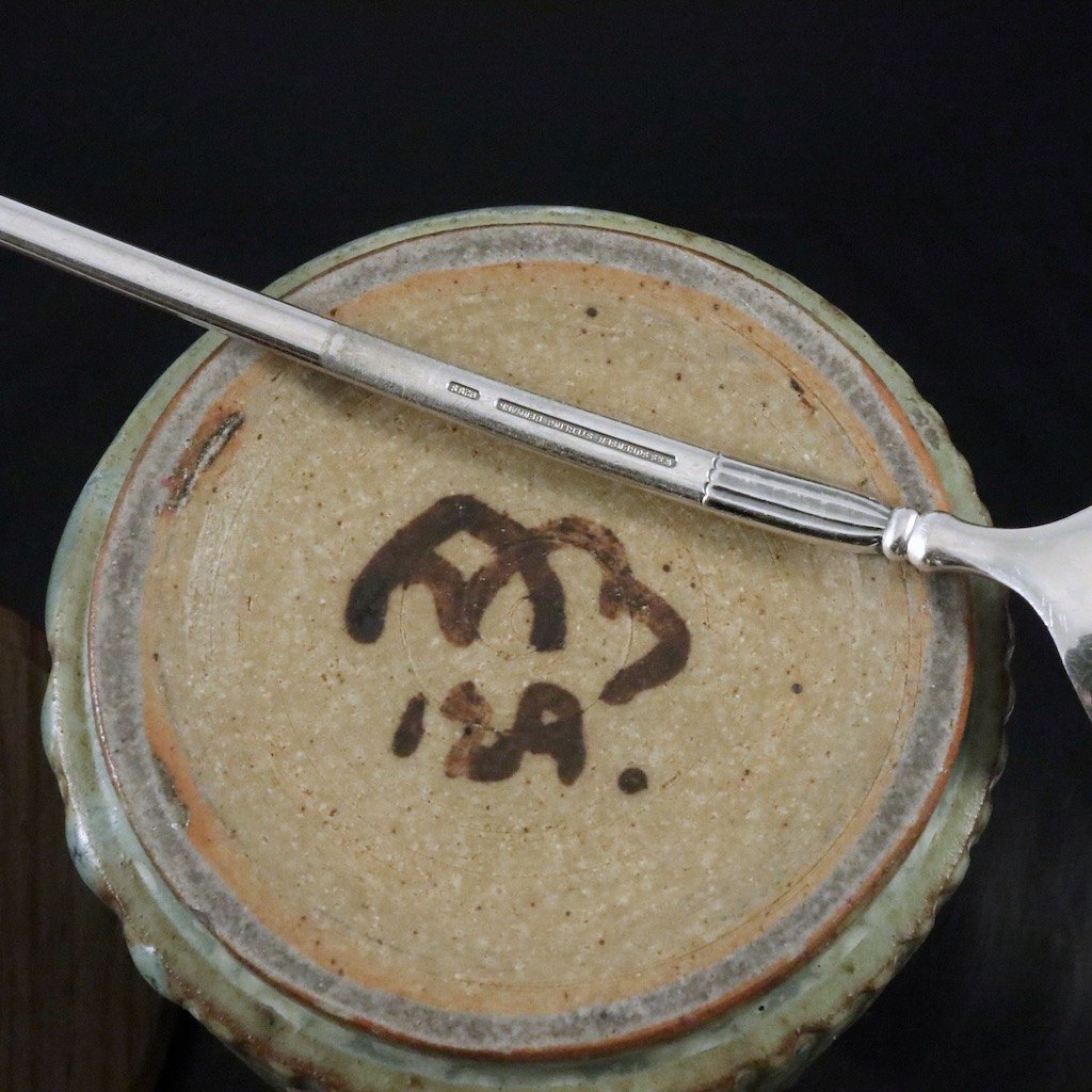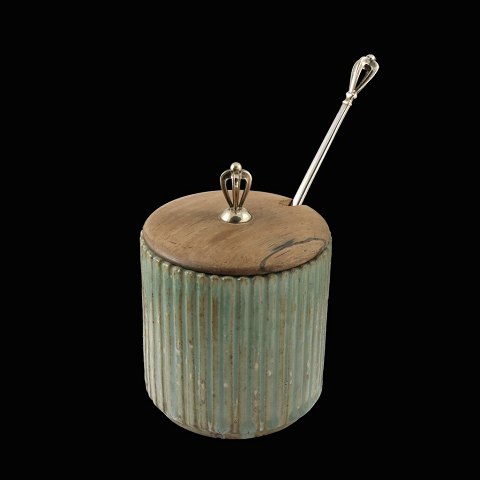 Arne Bang - W. & S. Sørensen. Krukke i stentøj med teaklåg samt ske i Sterling Sølv.
