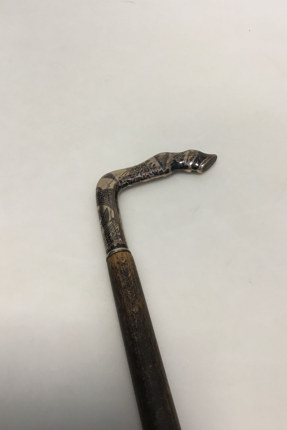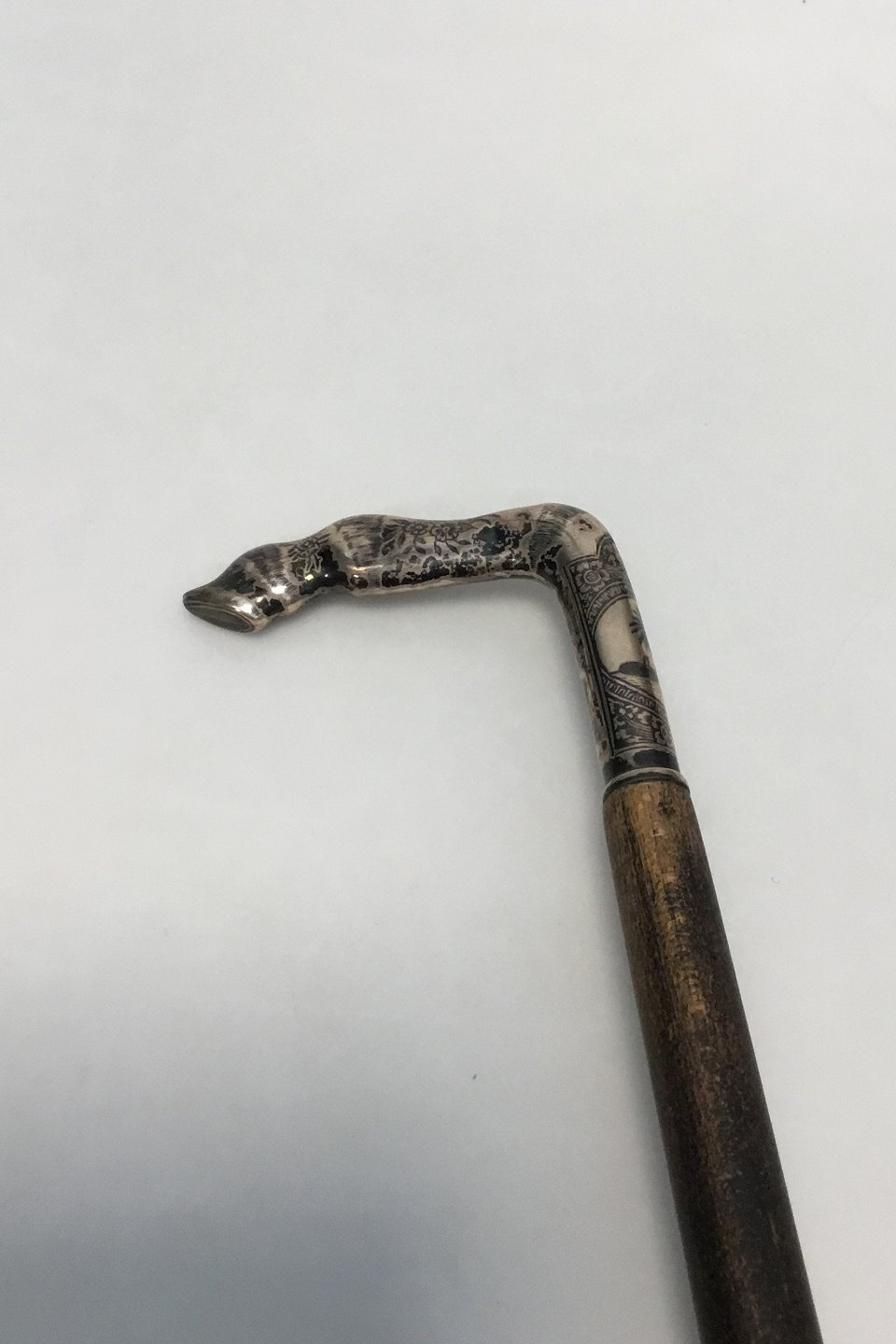 Spadserestok af sortlakeret træ med sølvhåndtag udformet som hestehov